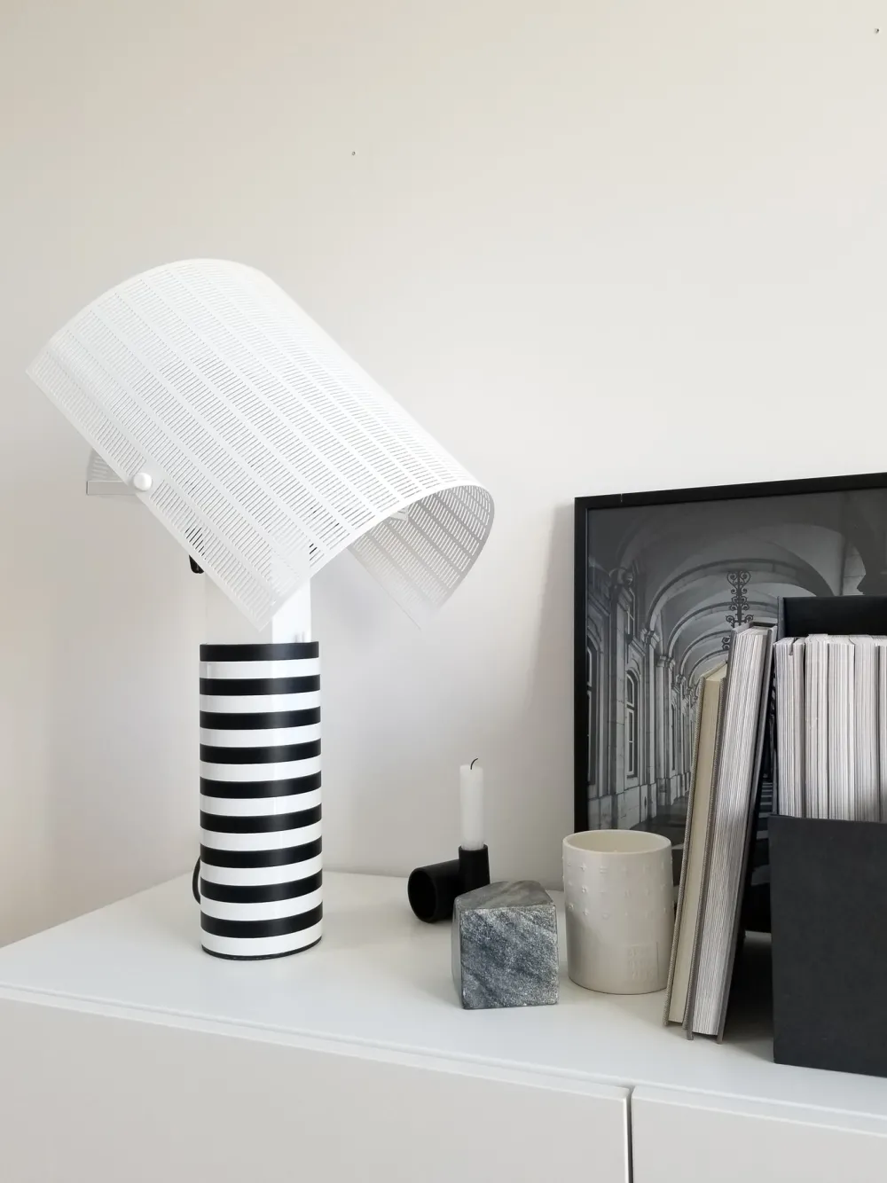 Structure en métal verni blanc et noir, diffuseurs orientables blancs en tôle d’acier perforé verni. Emission de lumière diffuse: la superposition et l’orientation des diffuseurs permet de créer des jeux d’ombres et de lumière.