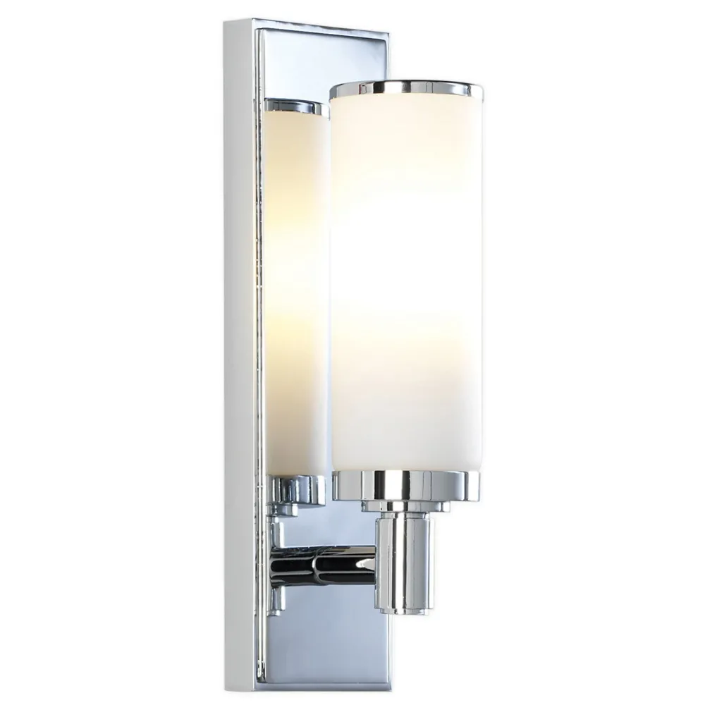 Applique murale pour salle de bain. Finition chrome poli, diffuseur en verre blanc opalin.