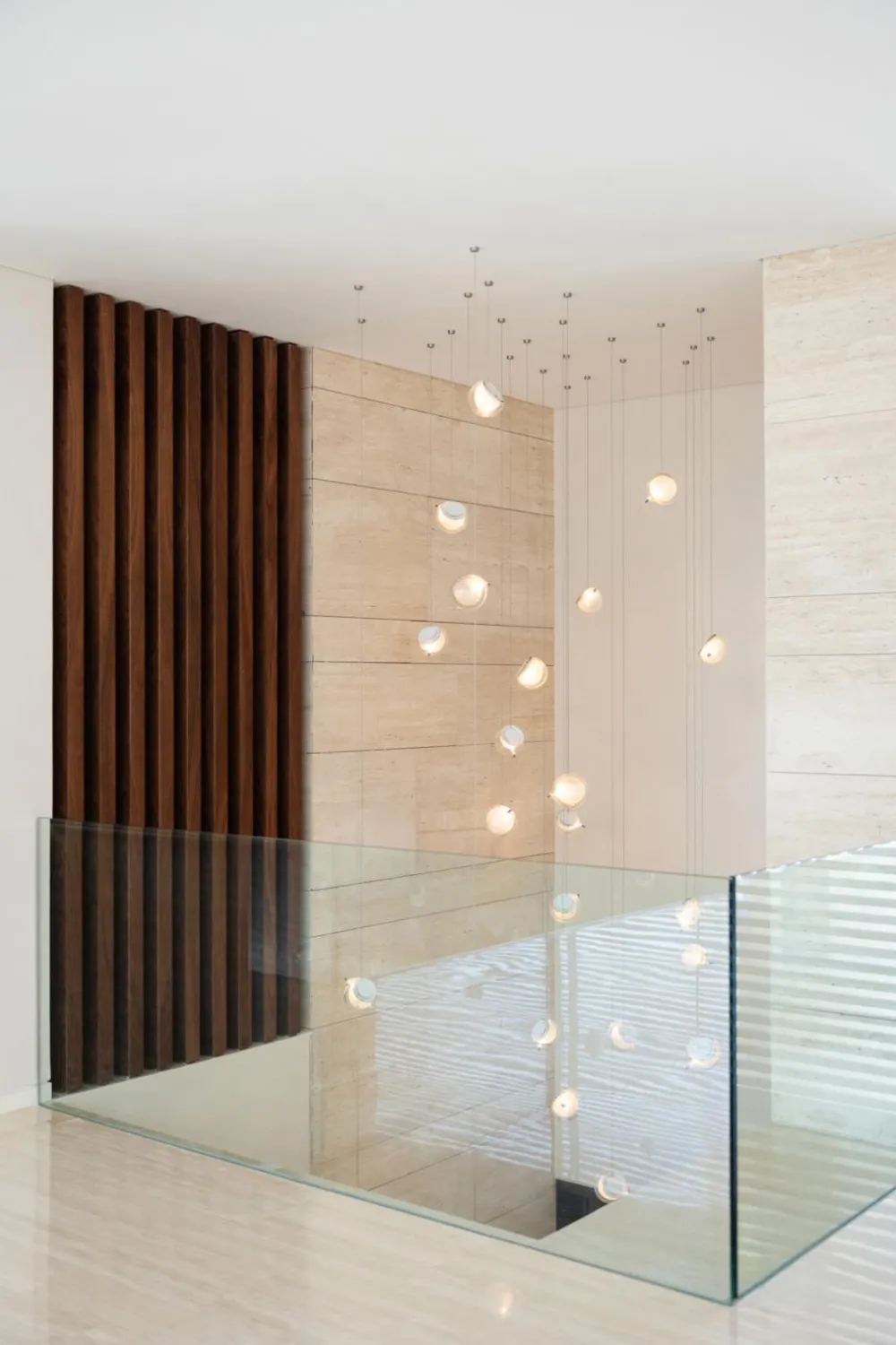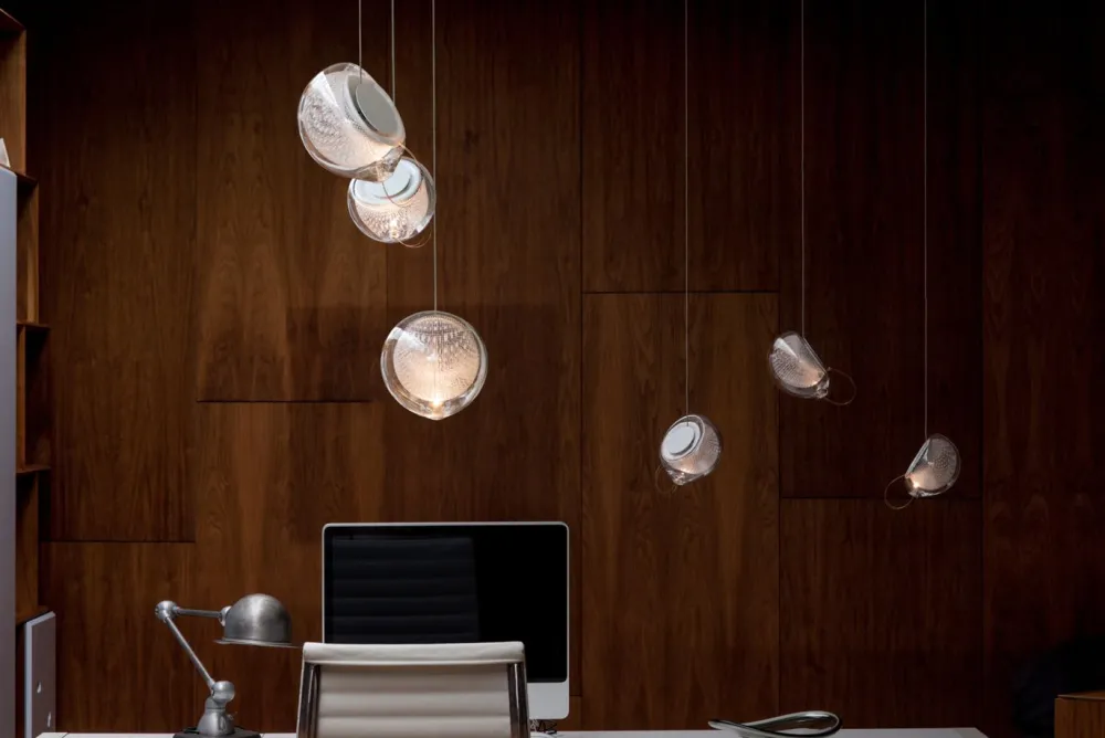 Formé en introduisant un espace vide dans une strate composée de verre blanc chaud et transparent, dans laquelle est insérée une maille de cuivre. L’espace e vide amène la couche blanche à se retirer à travers le maillage intégré, laissant de nombreuses vrilles de verre blanc suspendues dans un espace interstitiel. Sublime!
