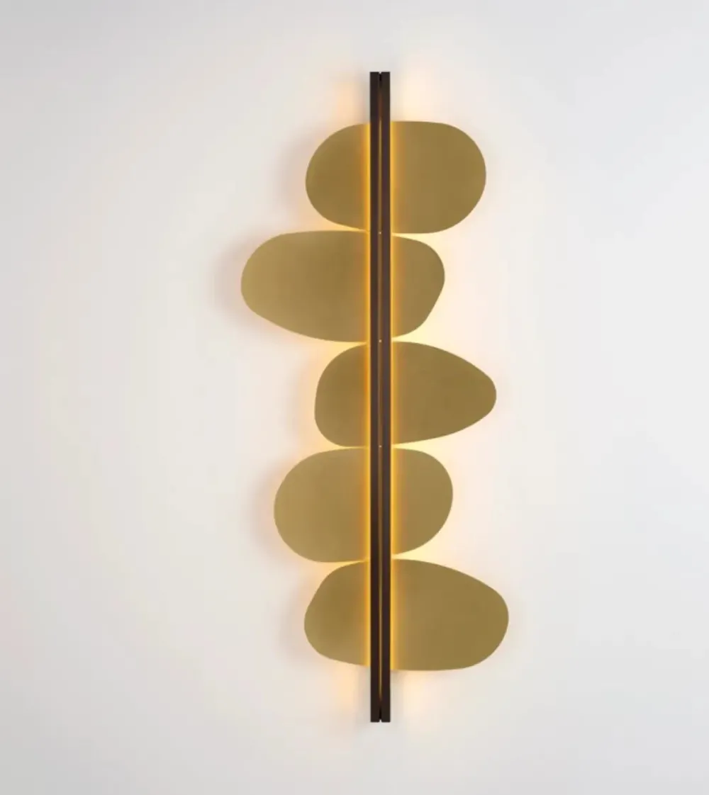 Laissez-vous charmer par les courbes harmonieuses de ce modèle d’applique Stone, une expérience lumineuse et géométrique en forme de véritable sculpture lumineuse de laiton massif avec éclairage LED intégré, elle habille votre intérieur et devient une pièce centrale de décoration. Le modèle Stone est composé d’une section carrée verticale de laiton finition graphite satiné intégrant diffuseur en polycarbonate et module LED. Les 5 plaques fines en forme de gros galets sont glissées sous la pièce centrale et amène dorure et chaleur à la lumière, pour un modèle pensé pour être posé à la verticale comme à l’horizontale.