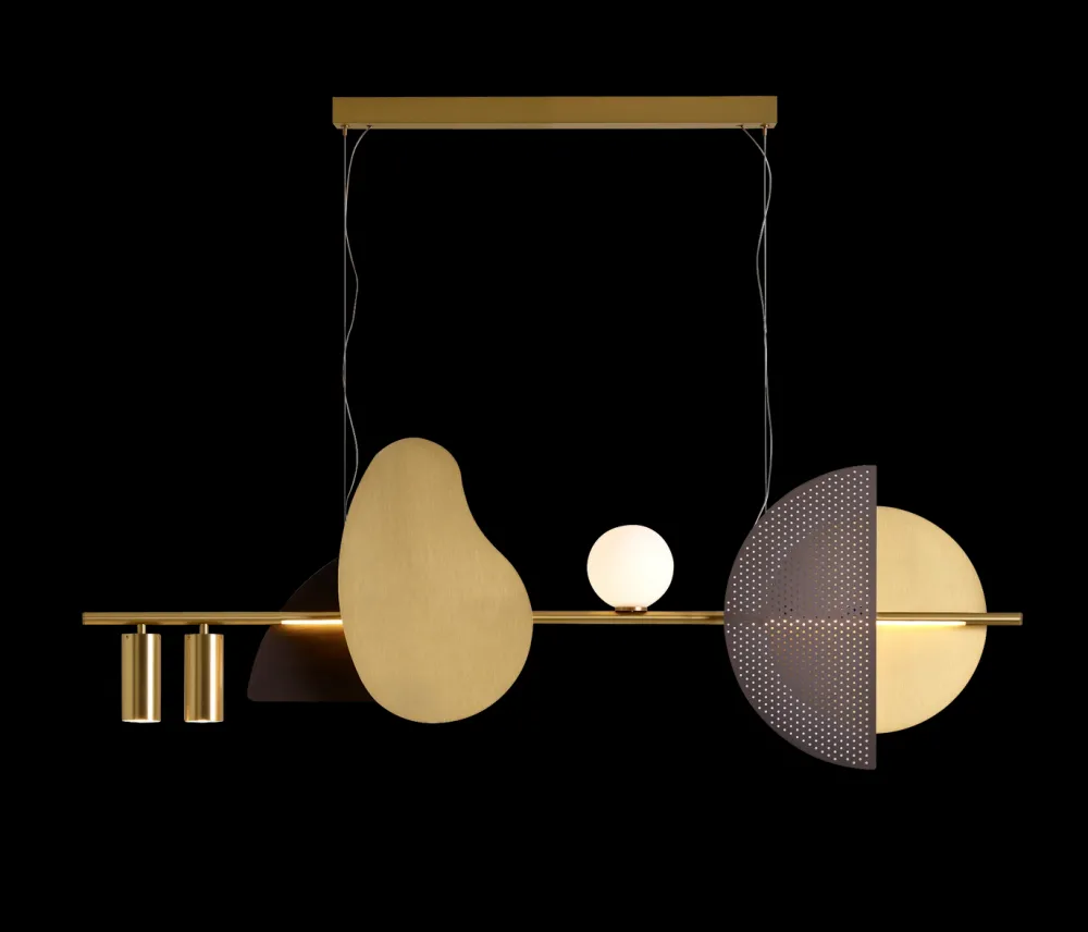 Inspiré de la peinture, et tout droit sorti du langage graphique imaginaire de Sylvain Willenz, NACHO rassemble sur une même ligne, divers éléments sculpturaux et lumineux. Des sources lumineuses telles que des spots directionnels, une sphère blanche opale brillante et des bandes de LED, sont juxtaposées à des abat-jour en forme de poire ou en demi-lune et d’autres formes, couleurs et finitions en laiton. NACHO propose une pièce d’éclairage fonctionnelle avec une expression surréaliste et rêveuse.