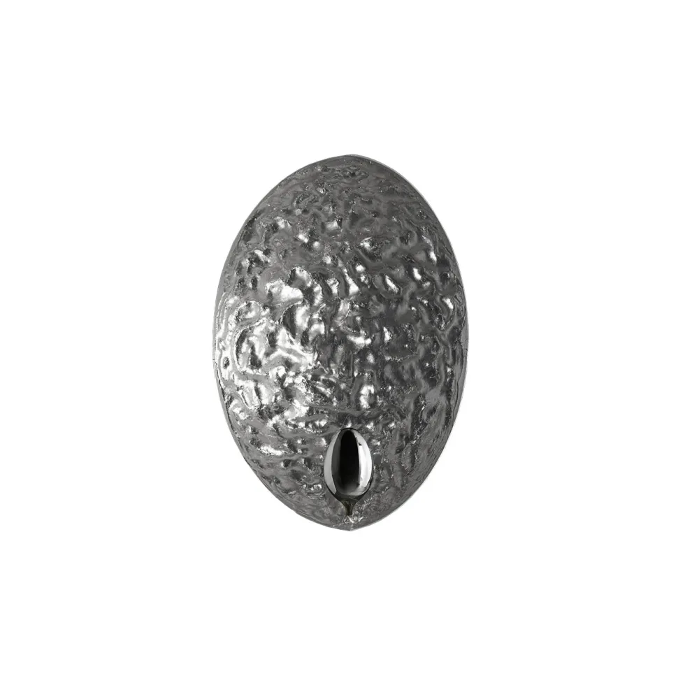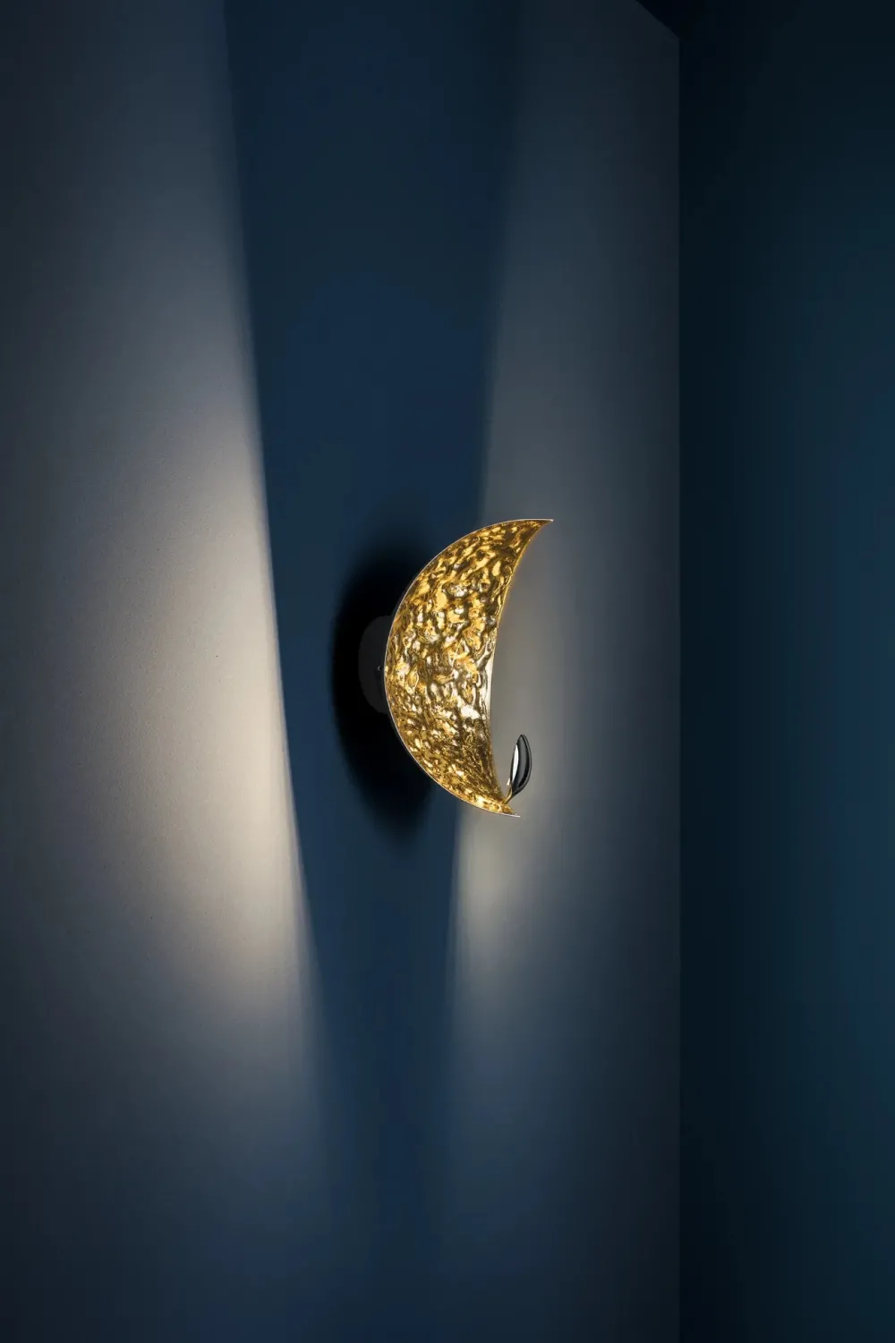 Avec ses creux et renflements inspirés de la surface de la Lune, cette lampe s’offre un design poétique dont le rayonnement ne passe pas inaperçu. Stchu-Moon sépare la source lumineuse de l’objet éclairant, qui acquiert ainsi une valeur esthétique indépendante. La réfraction de la lumière se confronte ici à des surfaces délibérément irrégulières, qui multiplient la quantité de lumière et rendent l’objet lui-même entièrement lumineux. Outre son cachet original, l’applique murale Stchu-Moon 05 se compose d’un corps en aluminium dont la surface irrégulière est recouverte de feuilles métalliques. La lumière émise depuis le réflecteur en acier est directement projetée sur le diffuseur d’où elle est réfléchie dans la pièce. Avec son apparence expressive et son éclairage doux, l’applique murale Stchu-Moon 05 meuble l’entrée, le couloir ou la chambre de sa forte valeur décorative. Sa fabrication manuelle fait que chaque pièce présente de légères variations de formes qui rehaussent son authenticité et lui confèrent une saveur artisanale.