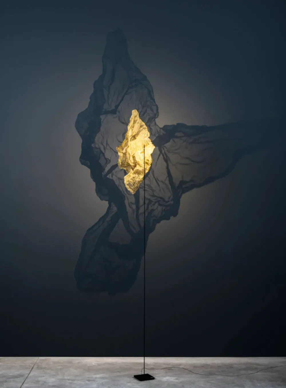 Le lampadaire Shadow est un voile en laiton suspendu dans le vide, éclairé par une LED intégrée à une tige en cuivre noir verni. Véritable œuvre lumineuse, son diffuseur crée une atmosphère à la fois minimaliste et envoûtante. Pour un effet optimal, il est recommandé de maintenir une distance de 30 cm entre le diffuseur et le mur.