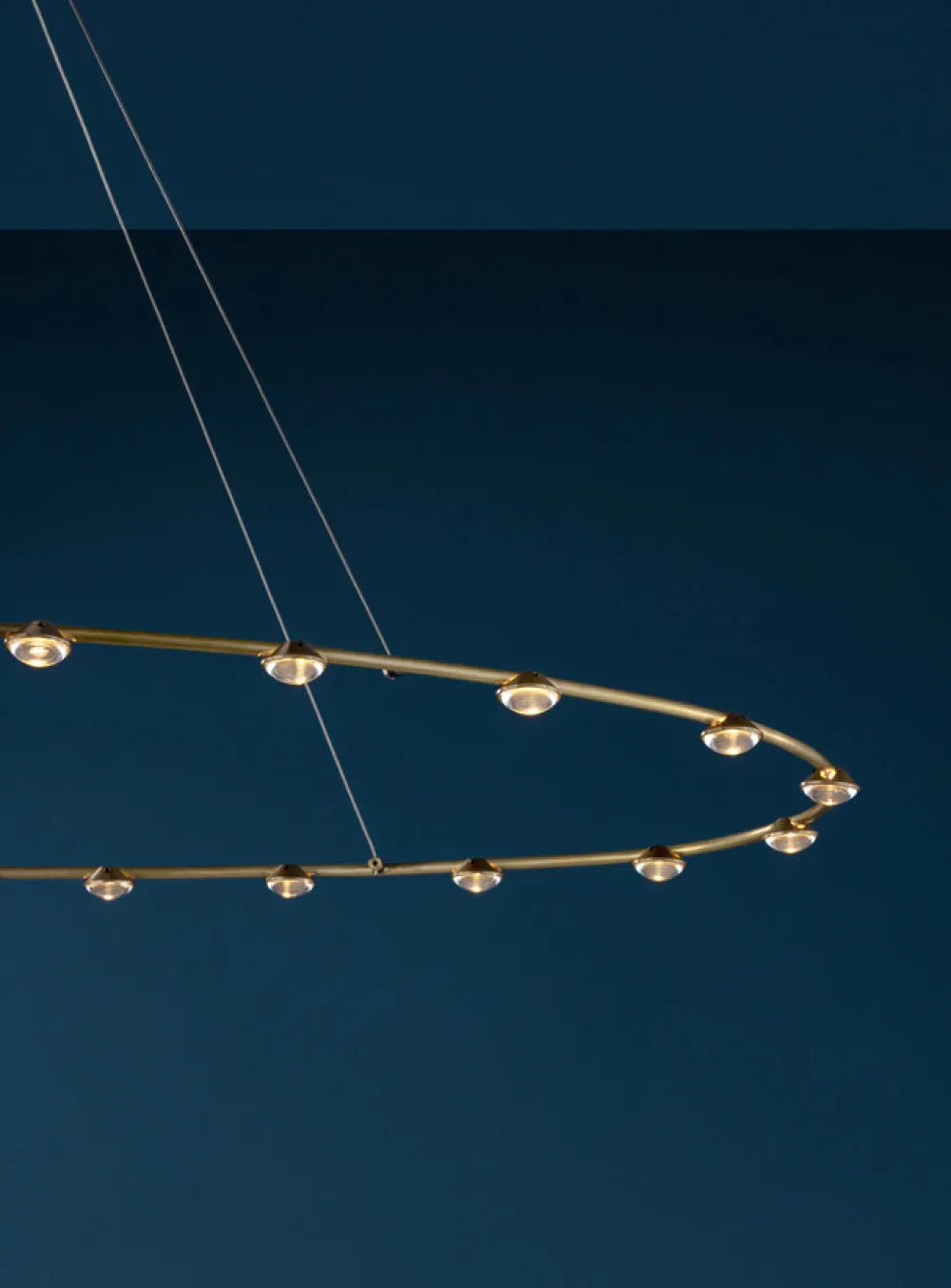 Petites Lentilles est le fruit d’une recherche d’une essentialité raffinée, c’est l’équilibre entre la lumière et la matière. Un ovale en laiton naturel – mesurant 120×60 cm – dessine dans l’espace une grande orbite suspendue, tandis que de petites lentilles transparentes et lumineuses en décorent la forme, en suivant son parcours. Petites Lentilles est la célébration de la lumière sous sa forme la plus pure, en prouvant que de la simplicité de quelques éléments structurels peut naître un objet surprenant.