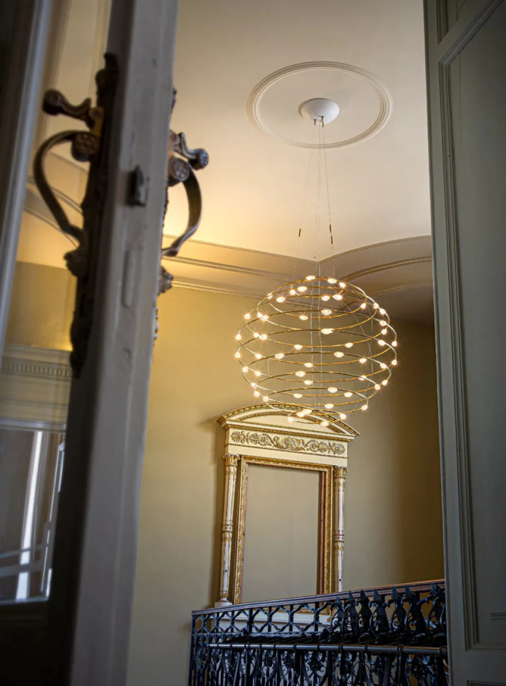 Petits Bijoux de Catellani & Smith est la représentation d’un « mouvement statique », l’effet d’une action qui semble imiter le geste de jeter une pierre dans un plan d’eau, en formant ainsi des ondes concentriques qui se propagent dans l’espace. Le concept de la sphère, le cercle comme métaphore de l’infini et de la perfection, sont des sujets chers et récurrents dans la production trentenaire de Catellani & Smith, et qui reviennent ici, dans cette nouvelle collection de lampes suspendues, aussi simples dans leur forme qu’extraordinaires dans leur exécution.