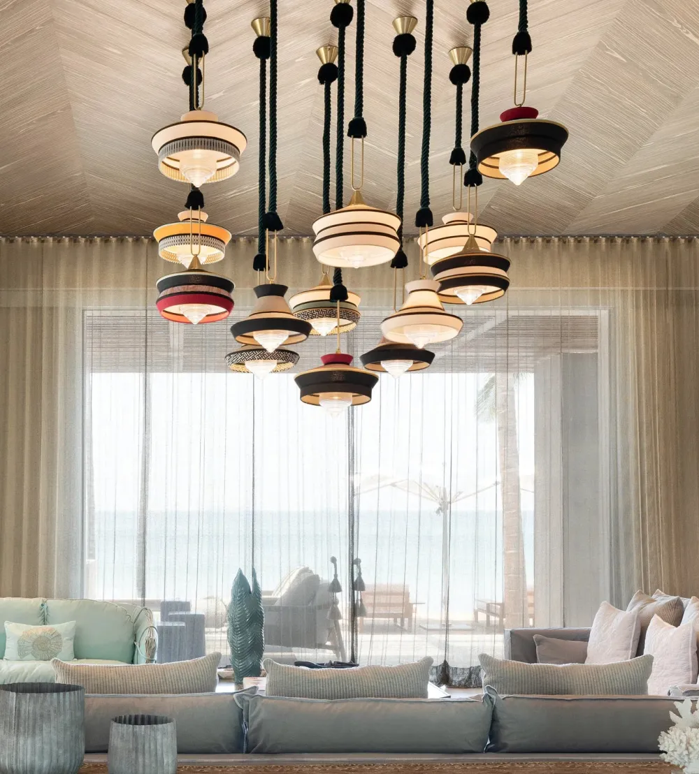 La magnifique gamme Calypso se décline également en version Outdoor, classée IP65, et propose un large choix de formes et de couleurs. Particulièrement décoratives, ces suspensions habilleront avec beaucoup d’élégance vos terrasses. Les tissus imperméables et ignifuges sont adaptés pour résister aux agents atmosphériques, à des températures particulièrement élevées ou basses, tout en conservant intacts la qualité des couleurs et la confection du produit. Les câbles électriques passent à l’intérieur de la corde marine de couleur verte et du support composé d’une pièce biseautée et d’une forme conique et circulaire avec une finition effet laiton satiné. La source lumineuse est placée à l’intérieur d’un cylindre en verre scellé pour garantir la protection IP65. Le diffuseur est en verre transparent.