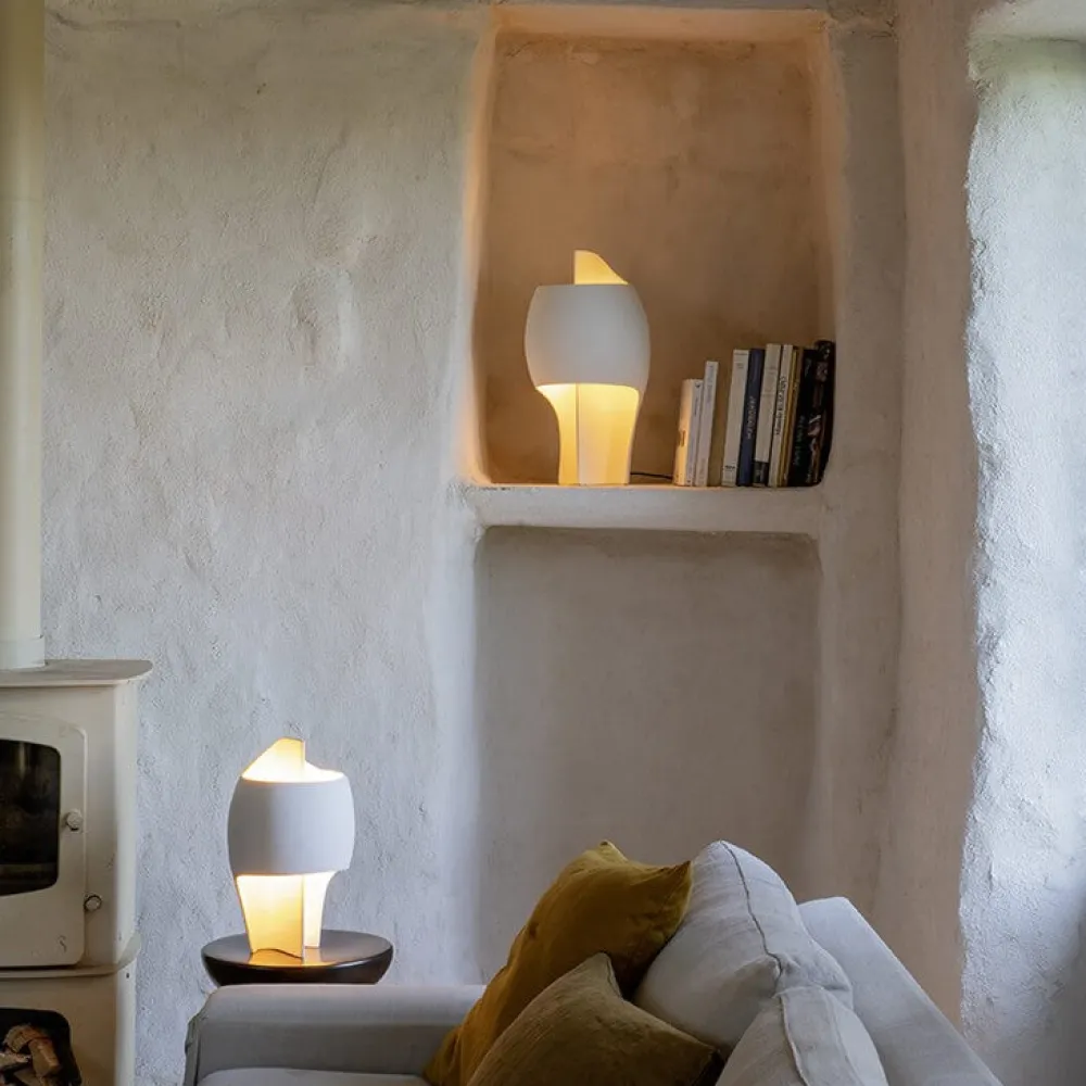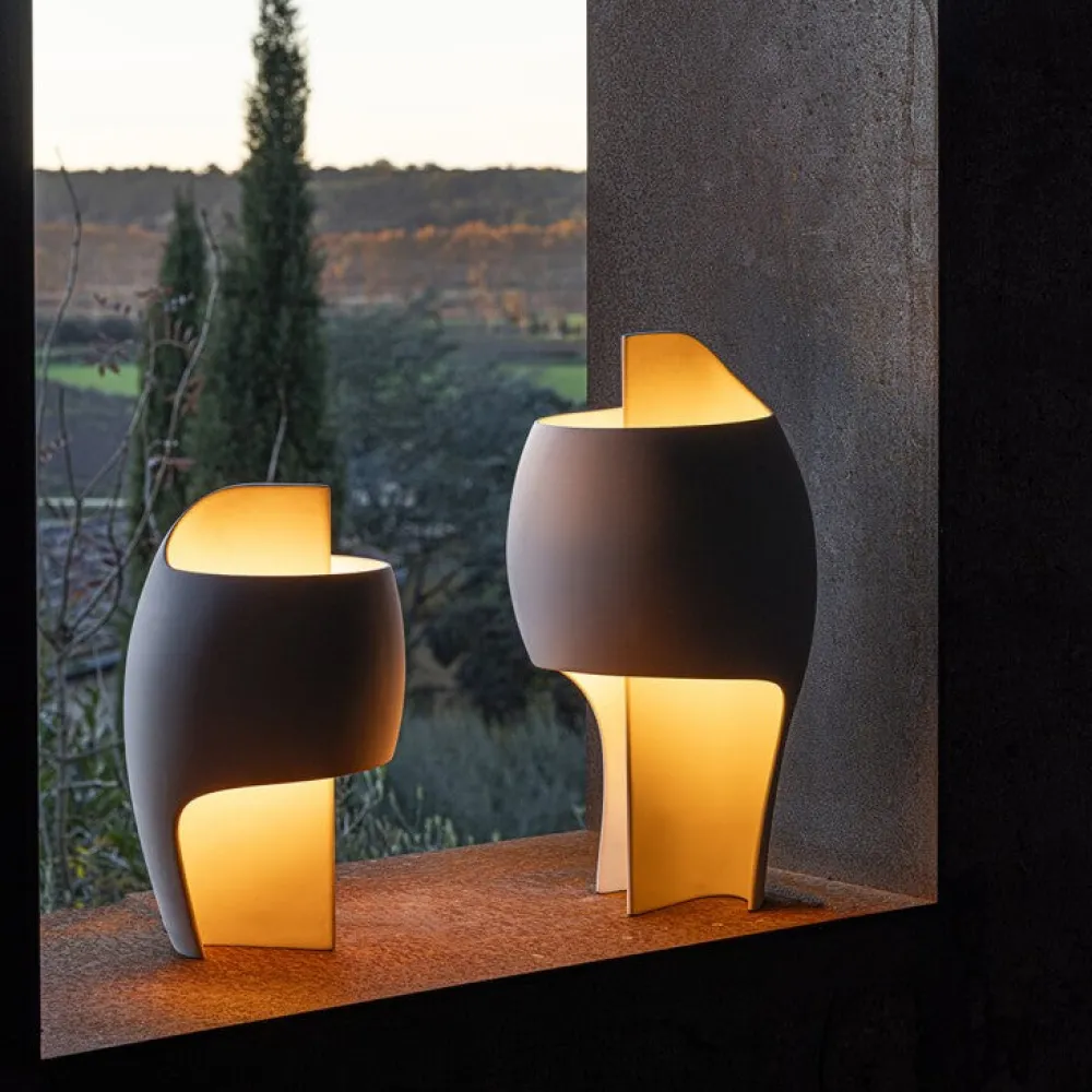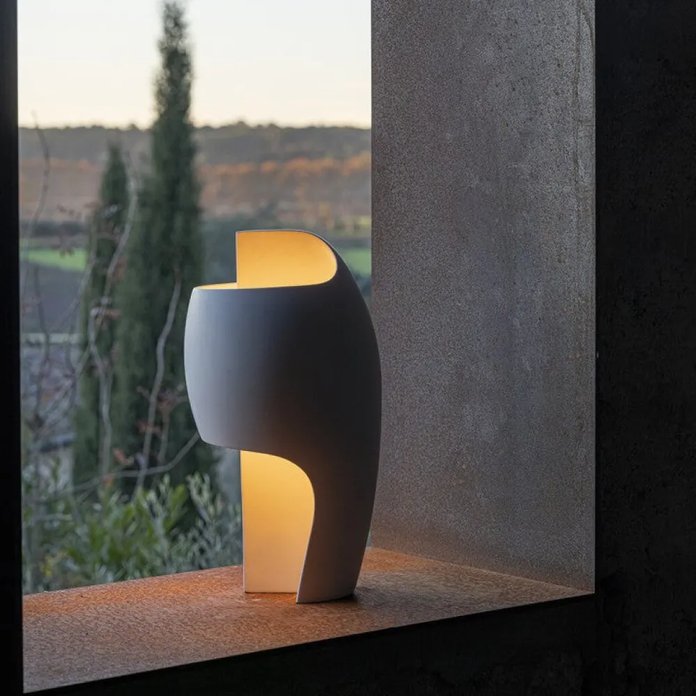 Sa silhouette sculpturale en gypse associée à une structure en aluminium lui confère une présence douce et pure. Objet blanc le jour, elle devient, la nuit venue, une source lumineuse réconfortante, pensée pour accompagner les moments de calme, de lecture ou de contemplation.
