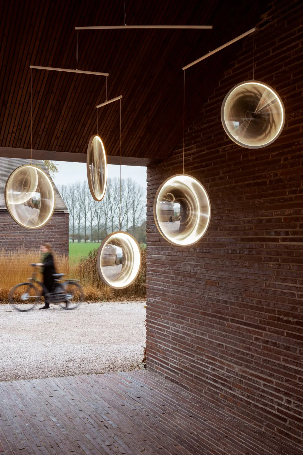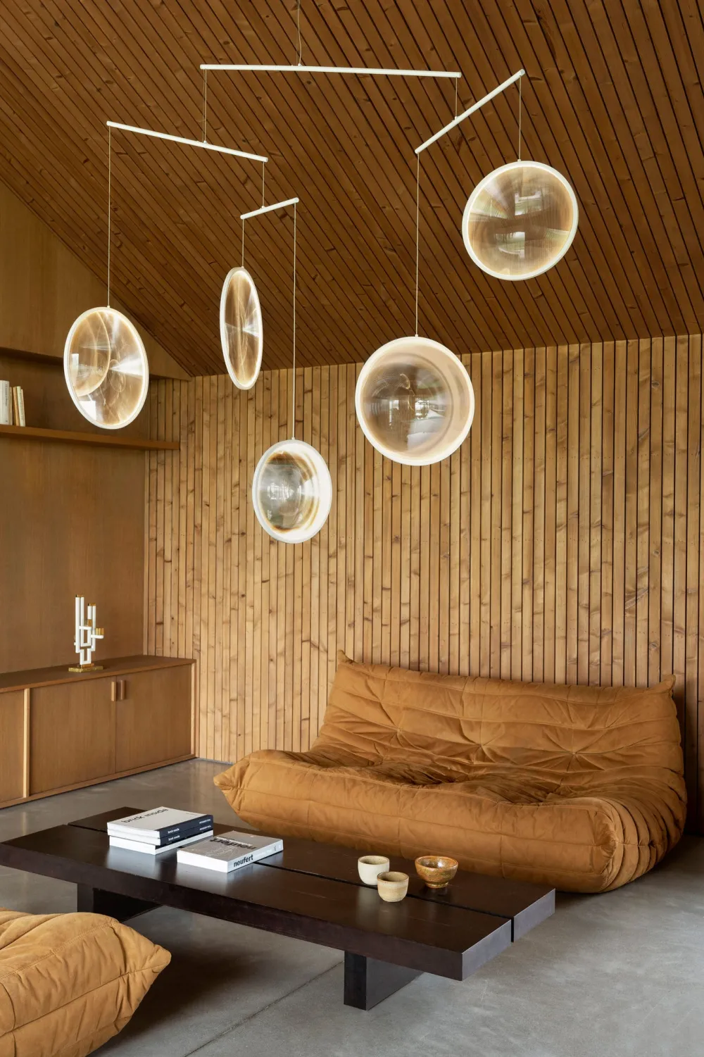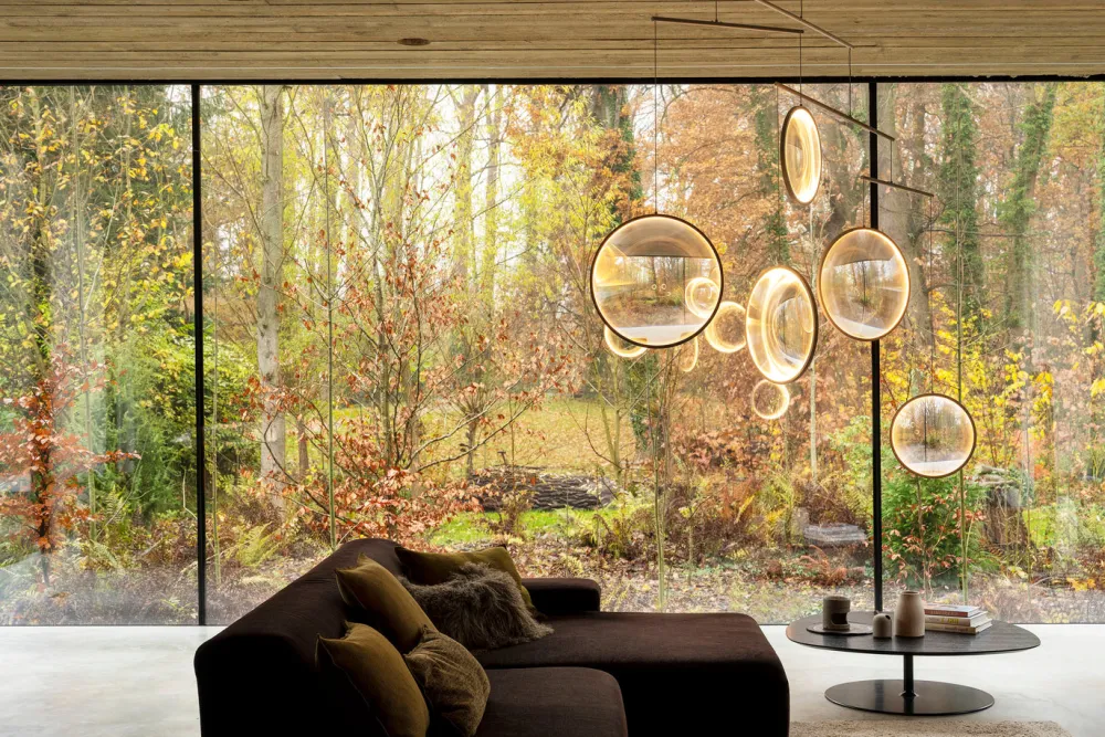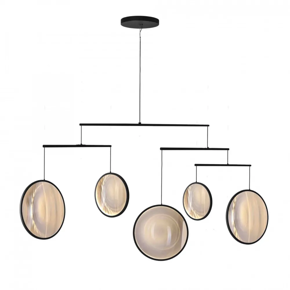 Poétique et aérien, ce luminaire interagit avec l’environnement pour construire un espace toujours changeant. L’environnement est fragmenté à travers les lentilles à effet « déformant ». Les différentes lentilles capturent, collectent et diffusent la lumière naturelle ambiante dans toutes les directions et sous tous les angles. Focus se balance et tourne doucement en réponse au flux d’air environnant et se transforme en configurations multiples. Une fois la lumière allumée, les disques s’illuminent créant une scénographie lumineuse exceptionnelle. Focus évoque des bulles de savon qui flottent dans l’espace. DCW éditions : ‘’ Comme des bulles de savon… Les planètes ne sont-elles pas des bulles de savon qui n’auraient jamais éclaté dans leur voyage. À force de les observer avec sa lunette d’astronomie, Yuji les a apprivoisées, pour les faire flotter dans une atmosphère légère.’’