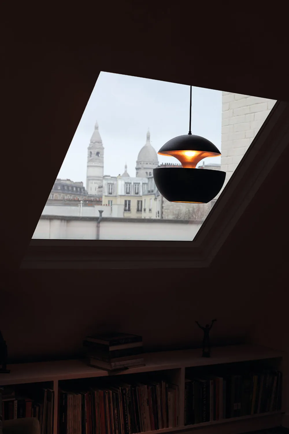 Bertrand Balas, architecte de Toulouse né en 1935, aime contempler les couchers de soleil sur la Garonne. Comme il aime à le dire avec une certaine musicalité : « Cela me fait du bien. » En août 1970, il crée le luminaire Here Comes the Sun. A première vue, cette lampe originale ressemble à toutes les lampes dites elles aussi originales. Mais allumée, la suspension Here Comes the Sun devient magique. La nuit devient douce, et rassurante. La suspension Here Comes the Sun éclaire essentiellement vers le bas, et convient donc particulièrement à l’éclairage d’une table. Sa partie ouverte centrale offre également un éclairage d’ambiance, ce qui lui permet d’être également placée dans une entrée ou une chambre.