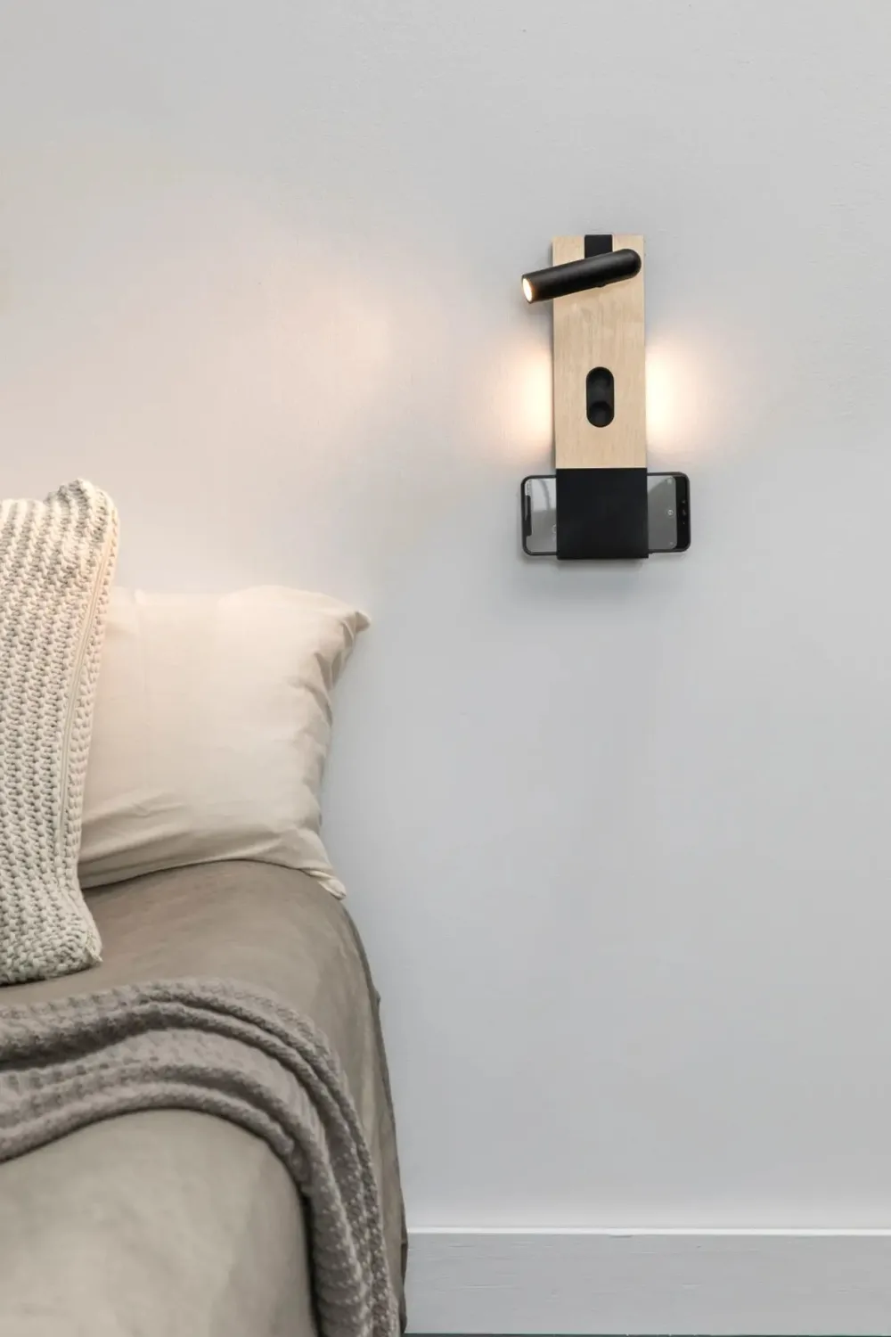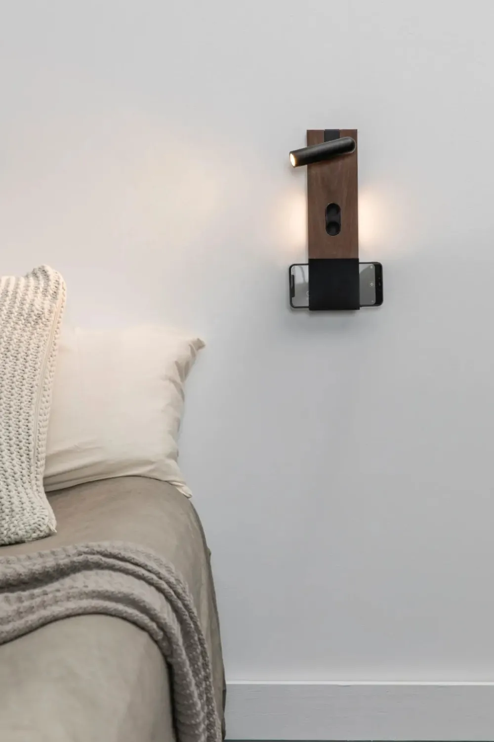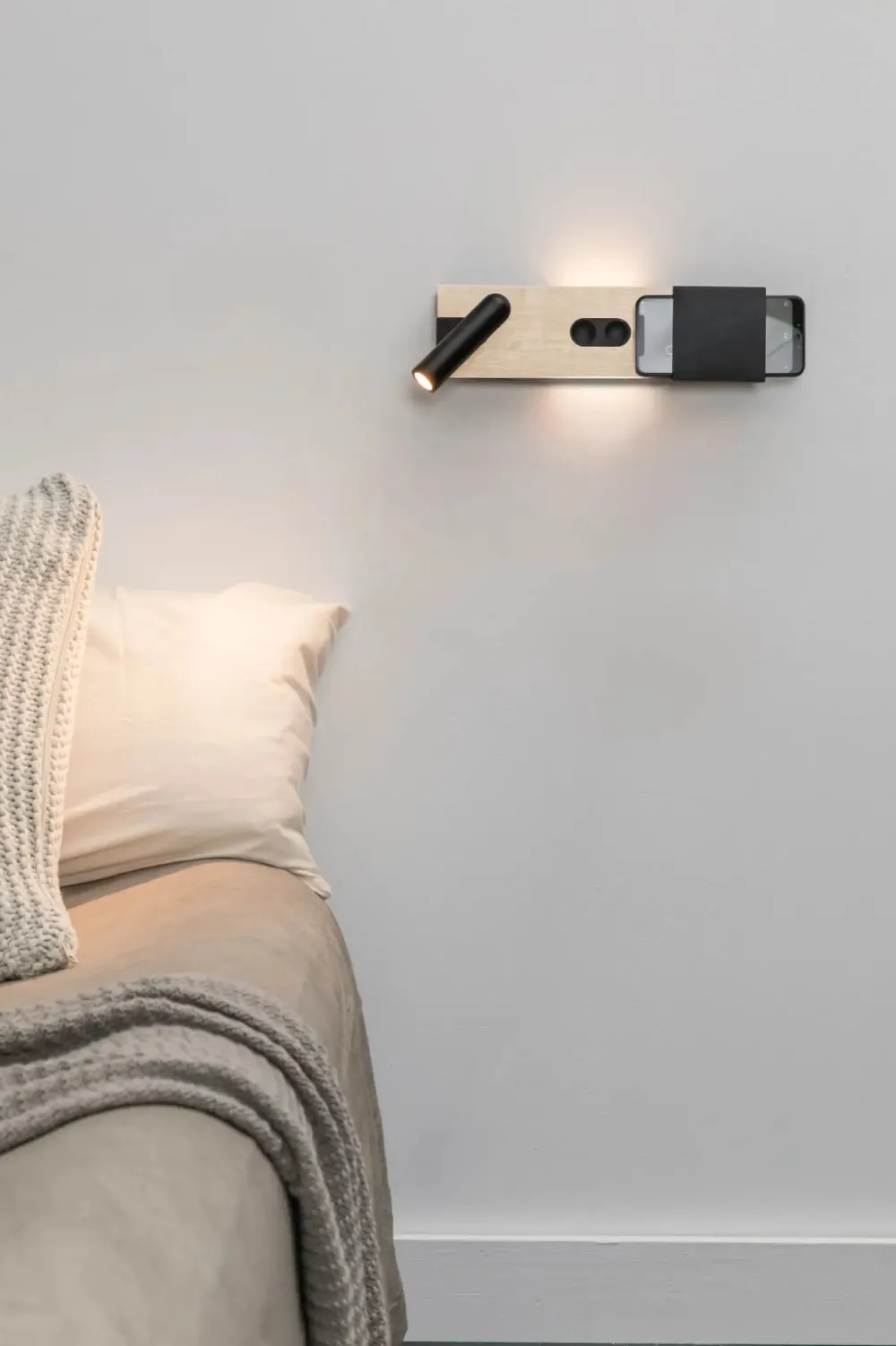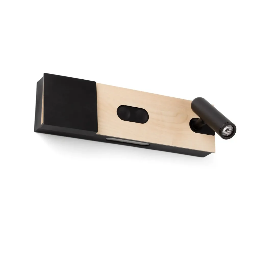 MAGOS est une applique murale en bois d’érable dessinée par Faro Lab, pensée pour les chambres à coucher modernes. Ce luminaire combine deux sources lumineuses : une lumière indirecte projetée derrière la structure, idéale pour une ambiance douce, et une liseuse pivotante pour la lecture. Grâce à son design astucieux, MAGOS offre également un espace pour poser un téléphone, avec une fonction de recharge sans fil intégrée.