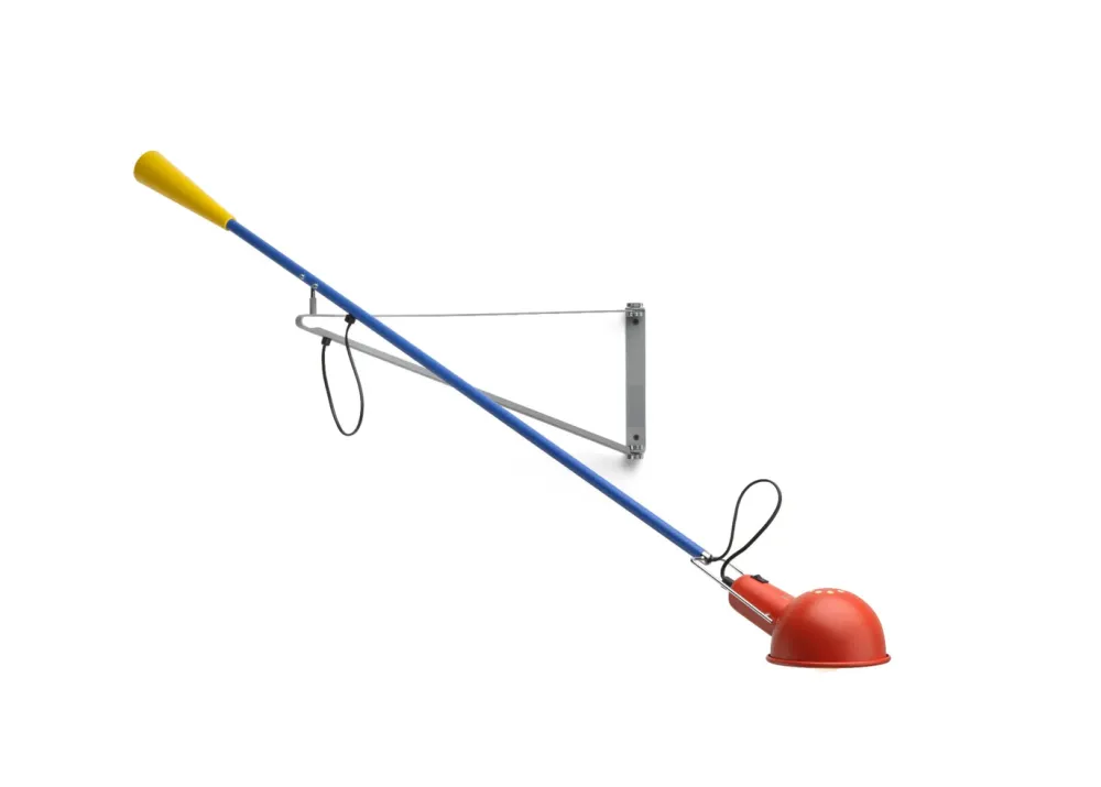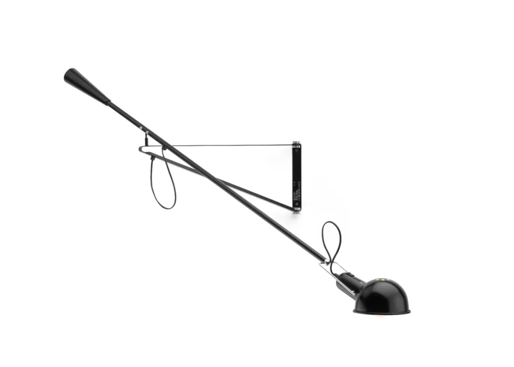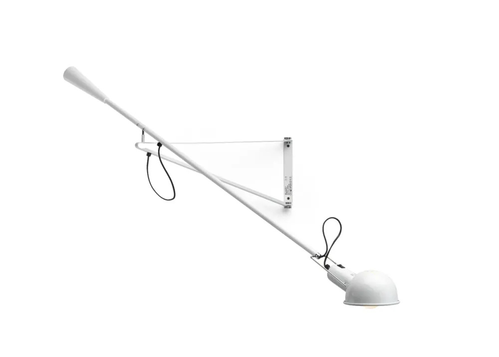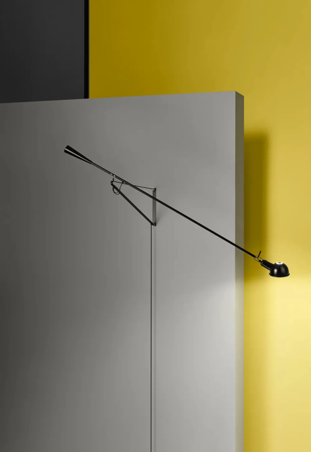 Le luminaire 265 small est une applique à lumière directe, composée d’une attache murale, d’un bras orientable avec un réflecteur à son extrémité et d’un contre-poids conique. Véritable jeu d’équilibre et d’orientation, la lampe 265 small peut être facilement tournée pour répondre aux besoins d’éclairage de n’importe quel environnement, que ce soit un salon, une cuisine ou un bureau. Le réflecteur, bras orientable et attache murale sont en acier recouvert d’un vernis liquide. Le support de réflecteur est en laiton chromé. Le contre-poids est en fonte.