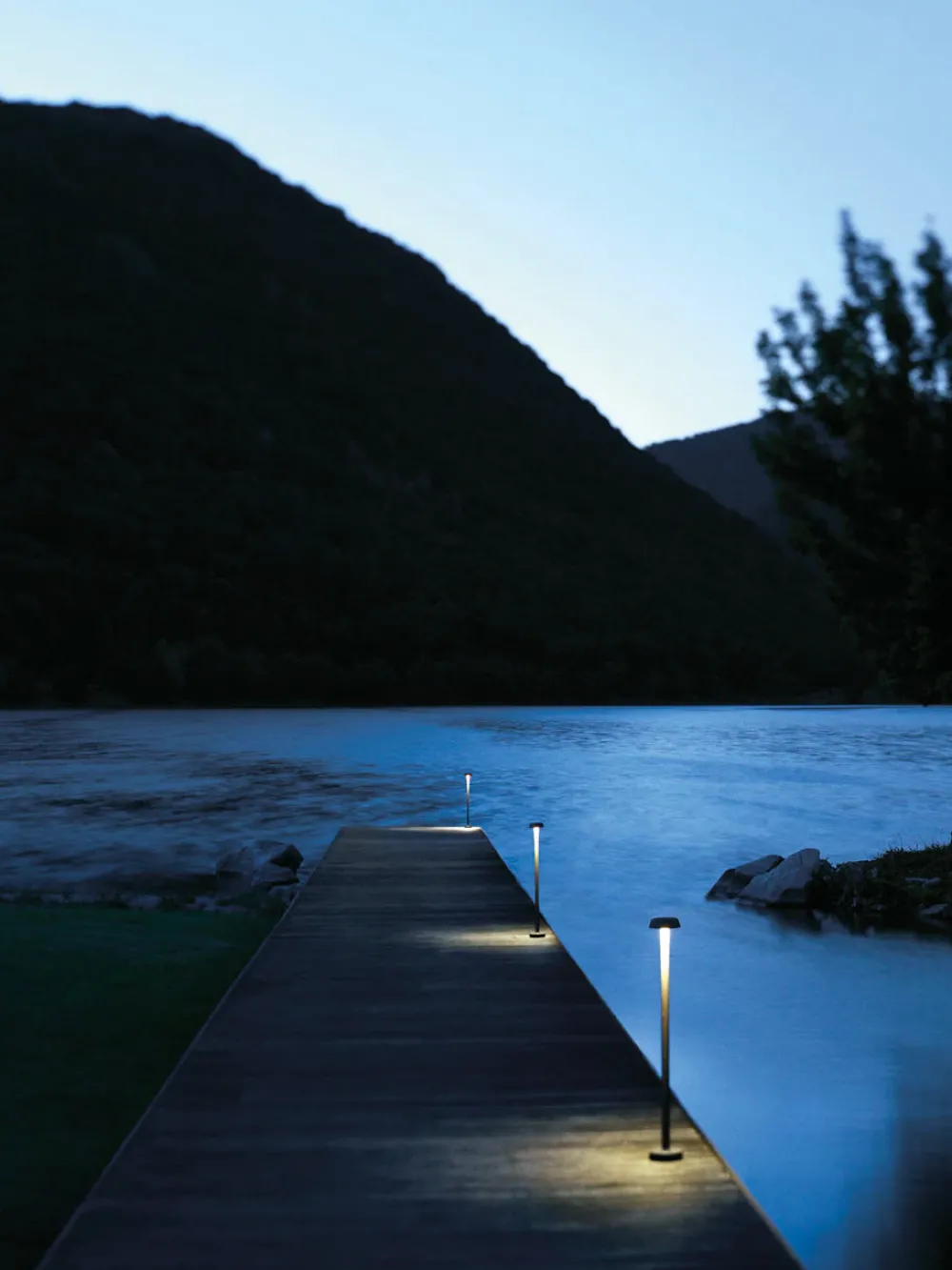 Son design minimaliste s’adapte discrètement dans l’architecture extérieure, le corps d’aluminium est disponible dans six coloris discrets. Des arrondis doux et des tiges de lampes droites caractérisent les lampes d’extérieur de la collection Belvedere. Les possibilités d’utilisation sont nombreuses, car la lampe peut être installée au bord d’un chemin dans un jardin, près d’une entrée ou route d’accès, sur les pontons ou entre les buissons et plantes d’ornement.