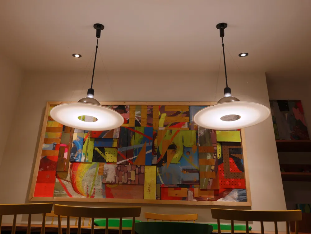 La suspension Frisbi a été créée par Achille Castiglioni pour l’éditeur Flos en 1978. Cette lampe au design trés structurée se compose d’un disque en polyméthylmétacrylate translucide percé en son centre et surmonté d’un cône en métal chromé qui laisse passer la lumière à travers un réflecteur. Cette suspension crée une ambiance lumineuse chaleureuse en diffusant simultanément trois types de lumière. Elle contraste avec la lumière tamisée par le disque opalin qui se réfracte en partie au plafond.