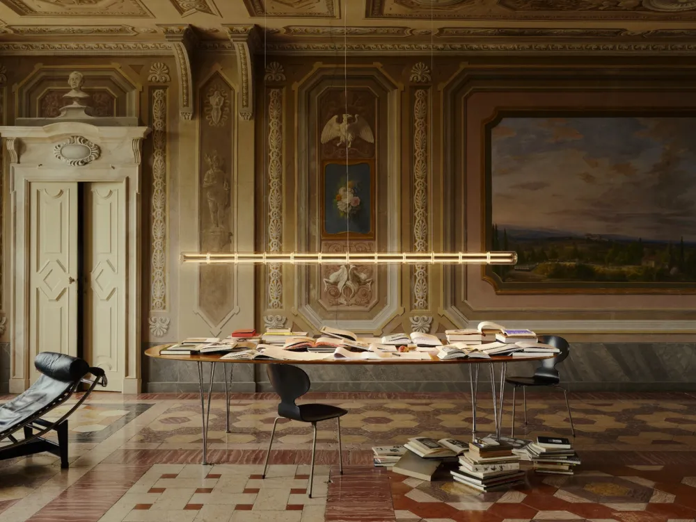 Luce Sferica S2 Cylindrique est idéale pour sublimer de grandes tables ou des espaces professionnels contemporains, en apportant une lumière à la fois fonctionnelle et sculpturale.