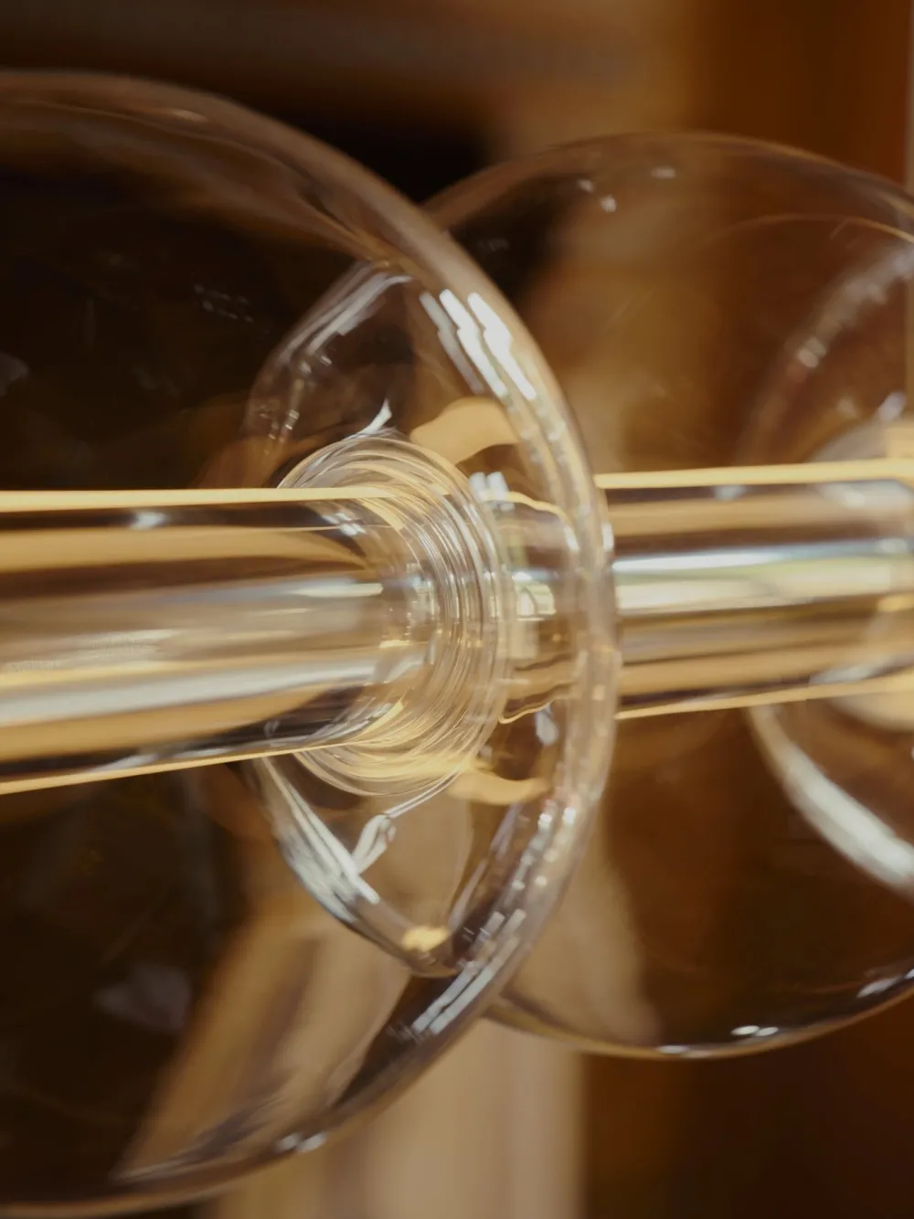 Le corps en aluminium poli, logeant deux bandes LED indépendantes, permet un contrôle tactile de la lumière vers le haut, vers le bas ou les deux. Chaque sphère est séparée par une entretoise, créant un jeu rythmique et fluide, entre tension géométrique et légèreté.