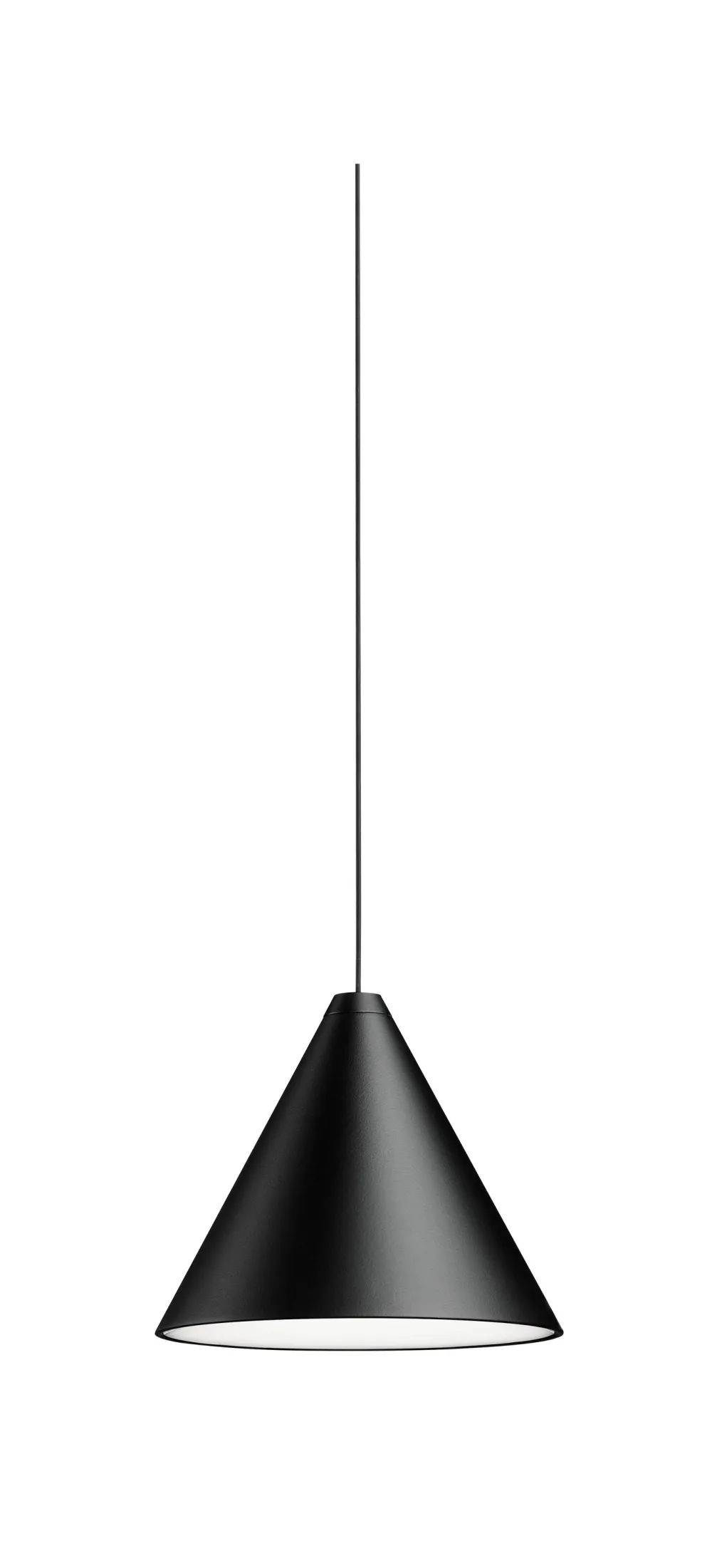 String Light Cône est composée d’un abat-jour sphérique, d’un câble de 12 mètres. Ses créations s’orientant vers l’abstraction, dans une recherche de pureté et de dépouillement, le designer Michael Anastassiades s’inspire ici des câbles électriques défilant par la fenêtre d’un train, reliant les pylônes et divisant le paysage. Transposé ici dans une architecture d’intérieur, un fin fil électrique noir complète l’environnement intérieur, séparant l’espace selon une infinité de configurations, sans se soucier de la position de la source d’électricité. String Light éclaire d’une lumière diffuse. Son corps est en aluminium moulé sous pression peint en noir mat et recouvert d’un verni transparent soft touch, équipé d’un diffuseur optique en polycarbonate ovale et d’un système de suspension de 12 mètres avec câble coaxial renforcé en Kevlar. Le luminaire vient avec une rosace, attache mur/plafond, en polycarbonate noir. Un interrupteur on/off électronique et équipé d’un mécanisme optique est situé sur le câble, juste au-dessus de l’abat-jour.