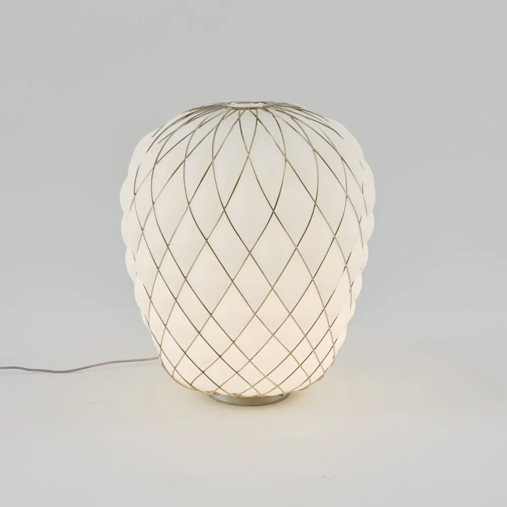 La lampe Pinecone, créée par la designer Paola Navone pour la marque Fontana Arte, sera belle aussi bien allumée qu’éteinte. La lampe à poser Pinecone a forcément une signification pour vous, un petit côté nuage, une cage à oiseaux ou autres objets du quotidien sortant de votre imagination, cette lampe vous rappelera forcément un souvenir heureux. Caractérisée par un diffuseur en verre soufflé, elle est disponible dans la version transparente et brillante ou dans la version blanc laiteux acidé. Le diffuseur est réalisé selon une ancienne technique du verre soufflé en cage. Le maître verrier souffle à la bouche la bulle de verre dans une cage métallique qui en retient partiellement l’expansion naturelle. Le produit final semble ainsi sortir de la cage tout en y restant emprisonné et crée un jeu de tension qui génère un objet suspendu au moment où il tente de se dégager, la cage est embellie par un traitement galvanique qui lui confère un aspect lustré et brillant. La version transparente permet notamment à l’observateur de lire une structure à deux niveaux en multipliant l’effet scénographique alors que l’entrelacement de la cage métallique projette sur les surfaces environnantes un jeu d’ombres kaléidoscopique.