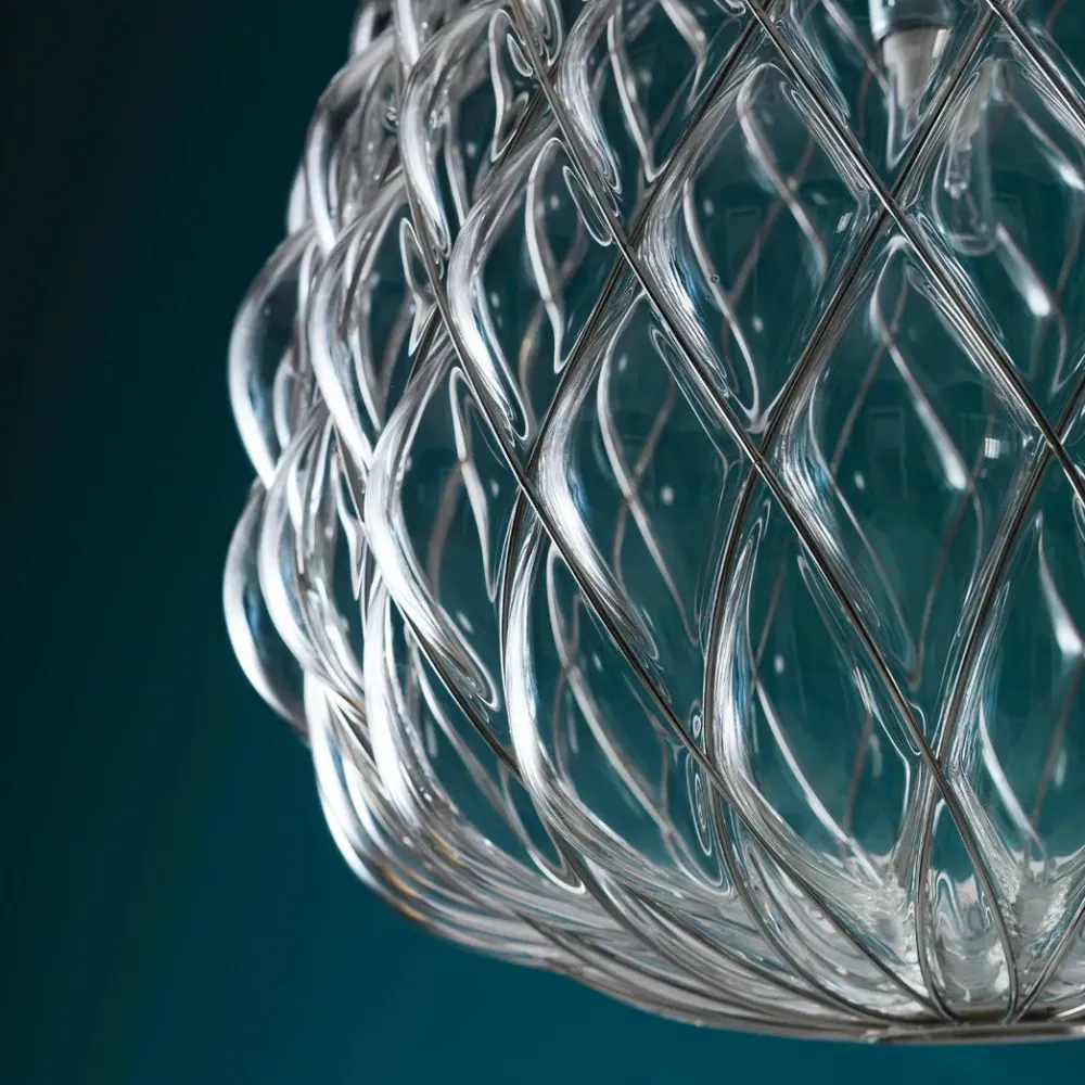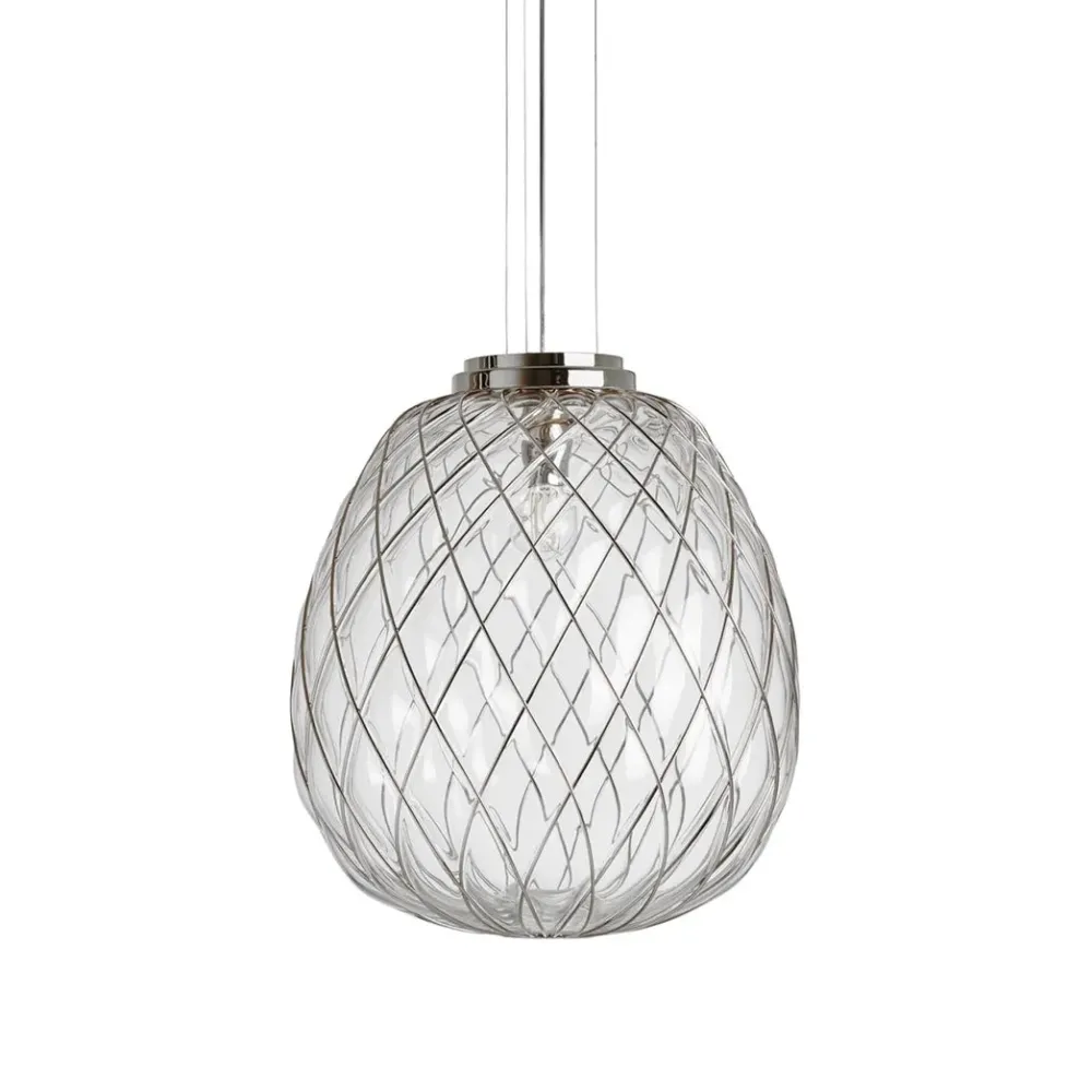 Pinecone est une suspension caractérisée par un diffuseur en verre soufflé. Elle est disponible dans la version transparente et brillante ou dans la version blanc laiteux acidé. Le diffuseur est réalisé selon une ancienne technique du verre soufflé en cage : le maître verrier souffle à la bouche la bulle de verre dans une cage métallique qui en retient partiellement l’expansion naturelle. Le produit final semble ainsi sortir de la cage tout en y restant emprisonné et crée un jeu de tension qui génère un objet suspendu au moment où il tente de se dégager ; la cage est embellie par un traitement galvanique qui lui confère un aspect lustré et brillant. La version transparente permet notamment à l’observateur de lire une structure à deux niveaux en multipliant l’effet scénographique alors que l’entrelacement de la cage métallique projette sur les surfaces environnantes un jeu d’ombres kaléidoscopique. La version en blanc suit par contre délicatement la cage et en souligne les géométries en générant une lumière diffuse élégante et agréable. Éclairé par une source lumineuse que l’utilisateur final peut choisir, ce luminaire est fortement suggestif et impactant aussi bien éteint qu’allumé.