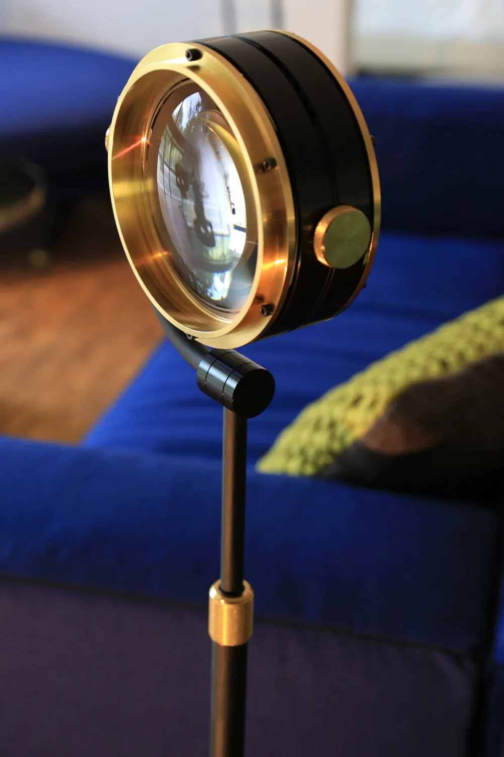 La réalisation d’un luminaire peut demander jusqu’à 42 heures de travail manuel. Un contrôle est réalisé tout au long de la création et fabrication du modèle, jusqu’aux finitions. Les matériaux utilisés font partie des plus nobles. Les optiques en verre usinées et polies avec traitements anti-reflets multi-couches sont couplées avec un système complexe de chambres noires, réflecteurs et diffuseurs. Le lampadaire Corduroy II dispose d’une tête amovible avec la possibilité de varier l’intensité à une fréquence supérieur à 3000Hz sur toute la plage de gradation. L’intensité se gère également par Bluetooth via une application offerte sur l’AppStore. Angle de 150°.
