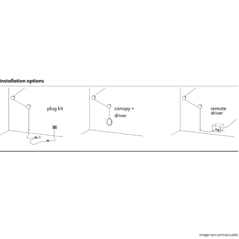 Important : pour une utilisation sur prise secteur le Plug kit (220-240V) pour Applique Azou est obligatoire. Pour une utilisation sur sortie électrique, veuillez ajouter la Platine Noir (sans driver) pour Applique Azou ainsi que le Driver dim. 1-10V ou push (220-240V) pour Applique Azou.