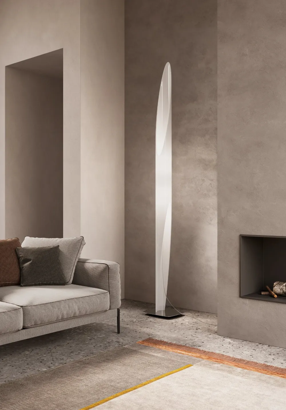 Ce jeu de coupes obliques crée un effet de tension visuelle, accentuant l’élan vertical du lampadaire tout en adoucissant son impact. Shakti s’inspire d’un langage industriel assumé — lignes droites, surfaces nettes, silhouette essentielle — mais le revisite avec raffinement et fluidité pour en faire un objet décoratif hautement contemporain.