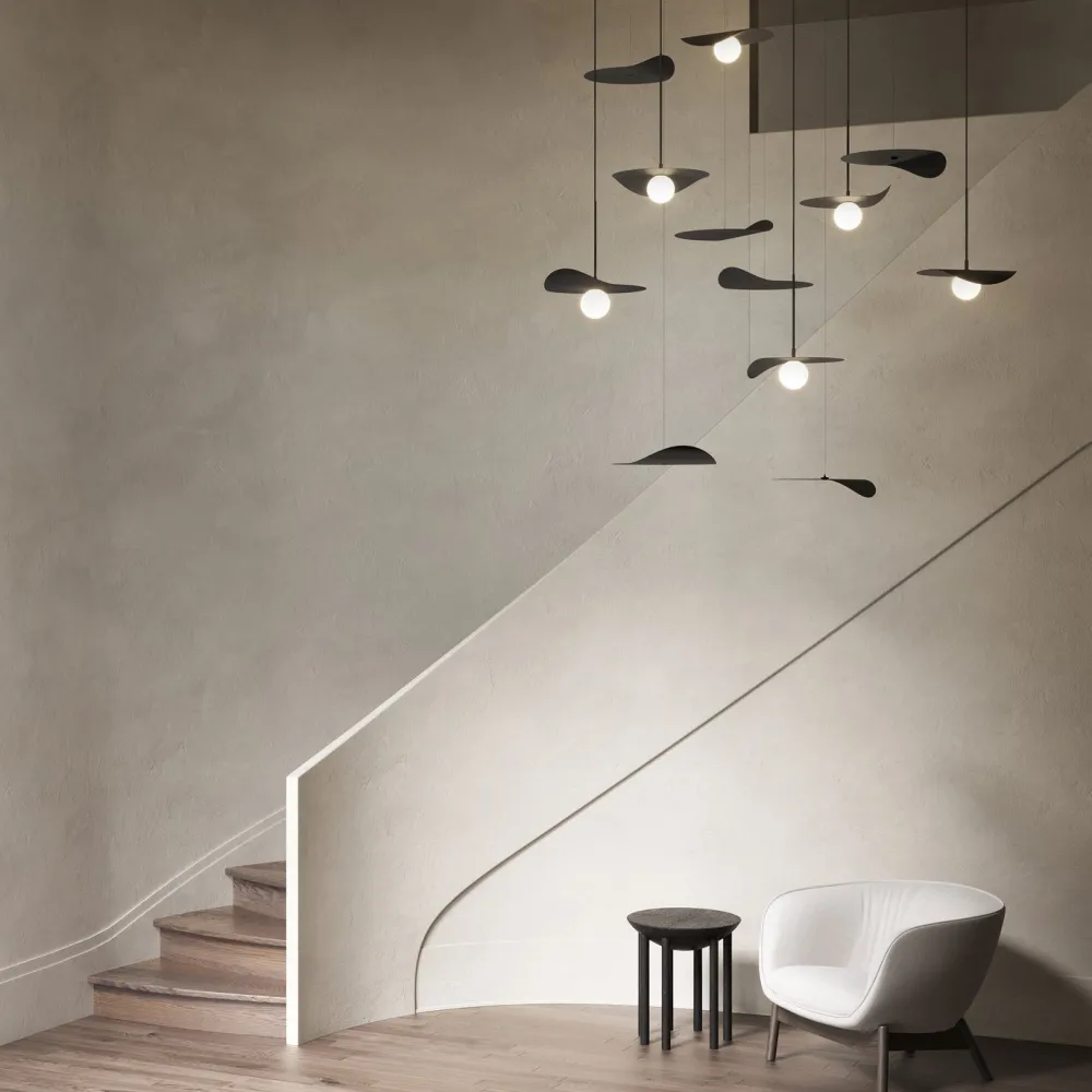 Inspirée par le mouvement délicat des feuilles portées par le vent, la suspension Flow de KDLN séduit par sa légèreté visuelle et sa poésie formelle. Chaque disque en métal évoque la forme organique d’un feuillage, offrant un rendu graphique et aérien, même lorsqu’il est éteint.