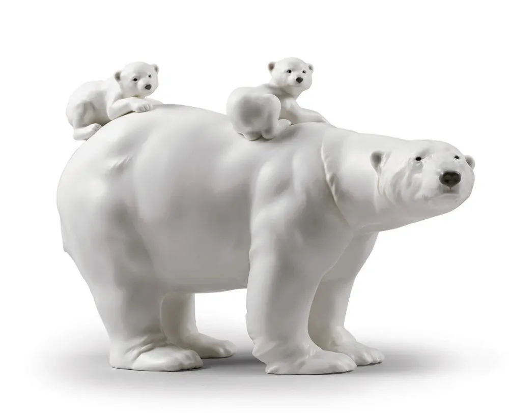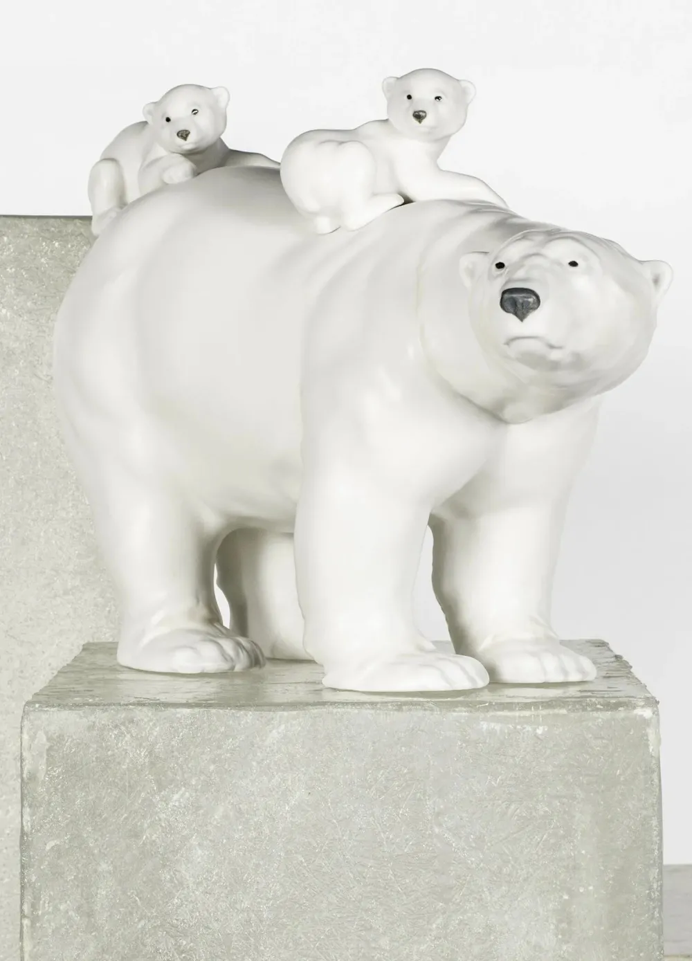 Figurine ours polaire en porcelaine blanc mat avec oursons à l’arrière.