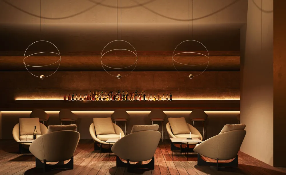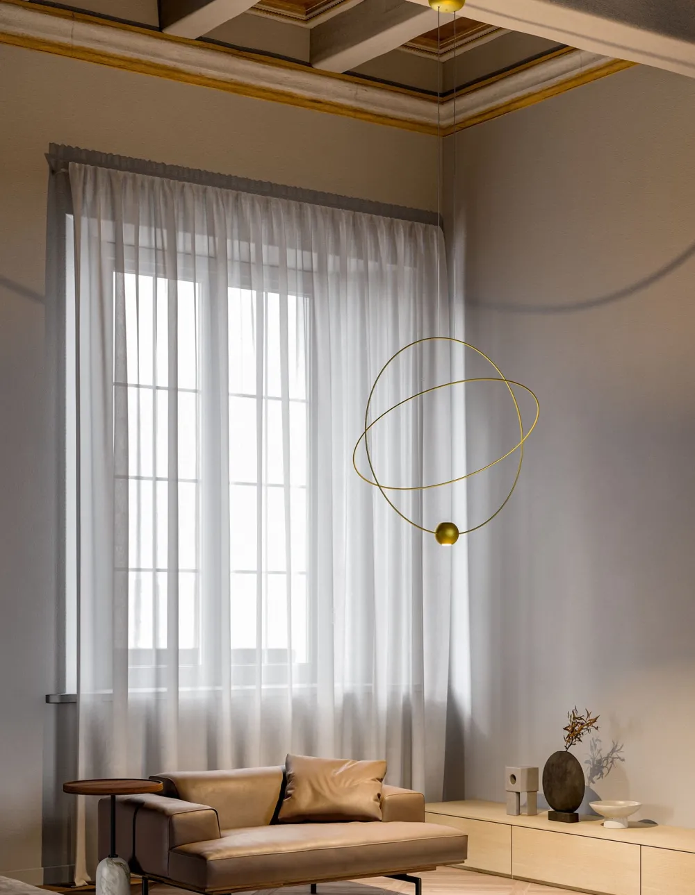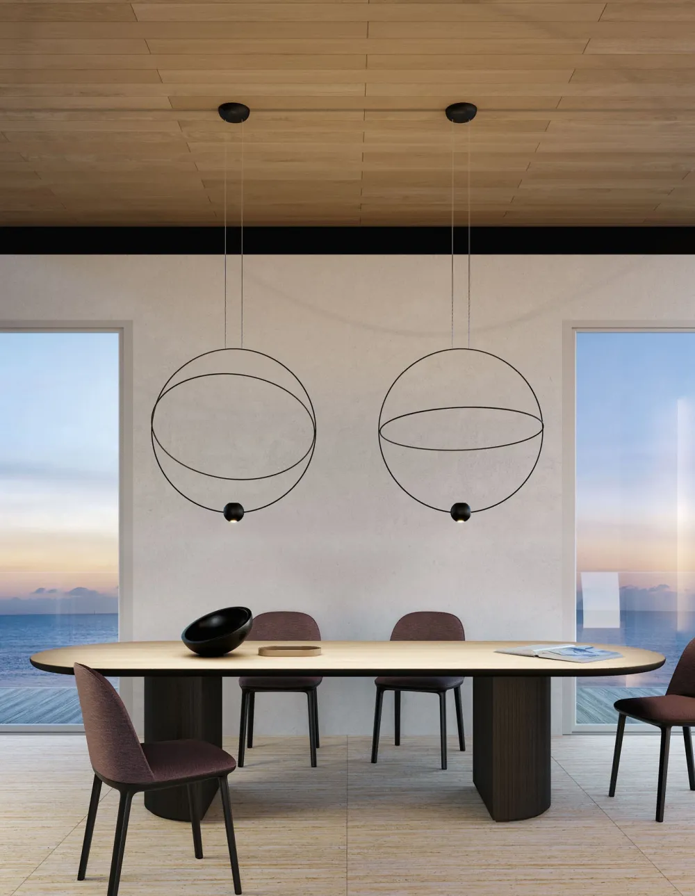 Elara se caractérise par deux anneaux métalliques, dont l’un peut être réglé à différents angles pour produire de la fluidité et mouvement, ainsi qu’une petite sphère au bas de la lampe qui contient la source lumineuse. La source lumineuse émet une lueur qui peut éclairer une pièce entière.? De plus, les utilisateurs peuvent diriger la sphère bi-émission, vers le haut ou vers le bas, selon le besoin en lumière.? L’anneau central peut être positionné pour atteindre différentes hauteurs et angles, permettant aux utilisateurs d’expérimenter la projection de lumière et d’ombres. Elara dispose d’un variateur contrôlé avec l’interrupteur d’alimentation mural, permettant aux utilisateurs de moduler l’intensité de la lumière. Disponible également en Ø60cm et en 3000K – Nous contacter.