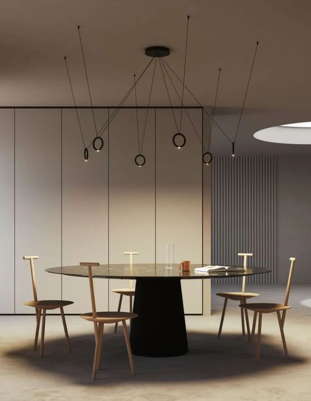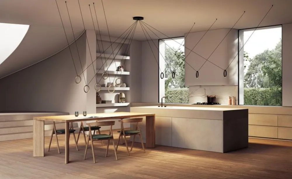 La collection IVY propose deux suspensions à LED constituées d’un anneau vertical suspendu par un câble. Ces luminaires peuvent être utilisés pour créer des compositions de luminaires spectaculaires en utilisant plusieurs platines de plafond. IVY est une solution d’éclairage minimaliste et géométrique, composée d’un anneau suspendu à un câble en caoutchouc noir qui alimente un module LED personnalisé. Avec des câbles simples et doubles (respectivement IVY I et IVY V), IVY offre une grande flexibilité, ce qui est de plus en plus important dans l’architecture et la décoration d’intérieur contemporaines, permettant au luminaire d’être dégagé de sa dérivation de plafond.