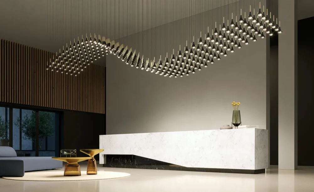 Inspirée de la légèreté de la pluie au printemps, Rain interprète le mouvement de la goute capturé dans un instant précis pour la suspendre dans l’espace et le temps. Simple et linéaire, sa forme fait ressortir la lumière LED en la projetant par un verre convexe. Le corps est disponible en six différentes et élégantes finitions – bronze cuivré, blanc mat, chrome brossé, or, or rose, noir mat. Seul, idéal pour une décoration minimale, ou créer un point de lumière scénographique et précis, par exemple au–dessus d’une table de chevet. Installé en cluster, jusqu’à 36 éléments monochromatiques ou teintés, Rain donne vie aux compositions spectaculaires aux caractères dynamique et original.