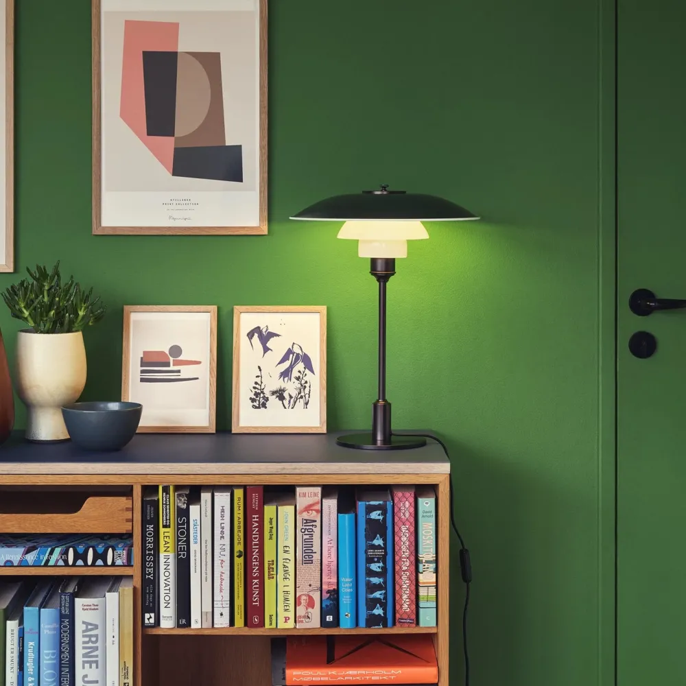 La lampe de table PH 3½-2½ est un modèle emblématique conçu en 1928 par Poul Henningsen, dans la continuité de son travail sur le système d’éclairage à trois abat-jour. Cette version est fidèle aux dessins originaux du designer danois, avec un abat-jour supérieur en métal doté d’un rebord roulé, qui renforce à la fois l’aspect visuel et la stabilité de la structure. Les deux abat-jour inférieurs, en verre opalisé soufflé à la bouche, diffusent une lumière douce et dirigée vers le bas, grâce à une réflexion optimisée par la surface blanche intérieure du métal. Le support est réalisé en laiton peint de couleur brune, recréant l’aspect authentique du laiton bruni utilisé dans les modèles historiques. Cette lampe élégante et technique est idéale pour les bureaux, les tables d’appoint ou comme lampe d’ambiance dans des intérieurs classiques ou vintage, apportant un éclairage chaleureux et sans éblouissement.