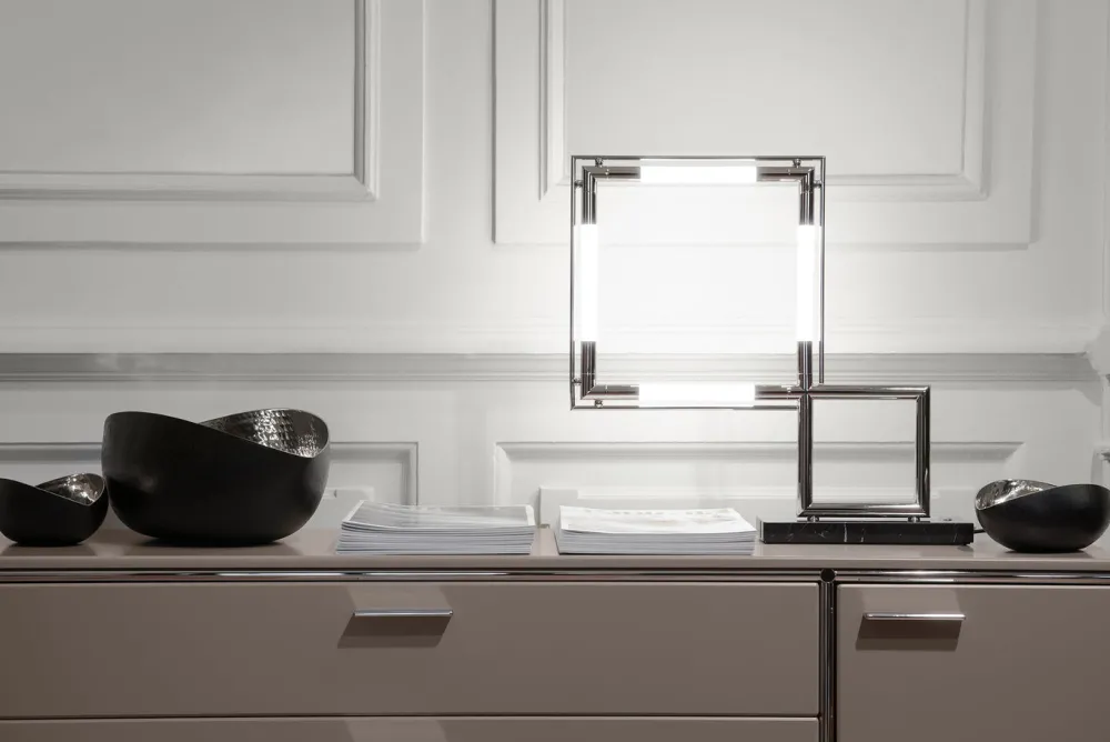 Quadro a été créé par LUMEN CENTER dans les années 70 sur décision du directeur artistique de l’époque, Gilles Derain, l’un des premiers admirateurs et connaisseurs des mouvements modernistes français ; par la suite, il entre dans le catalogue de LUMEN CENTER ITALIA, y restant sans interruption jusqu’à aujourd’hui. Cette nouvelle version est désormais en LED intégrée. A l’époque en 1929, ce design est révolutionnaire dans sa forme. La lampe Quadro est fabriquée avec des tubes en laiton chromé, les diffuseurs sont en acrylique sablé de haute qualité. Le socle est en marbre noir brillant. Un variateur situé sur la base en marbre permet d’ajuster l’intensité lumineuse.