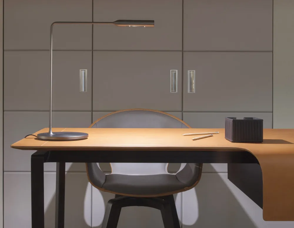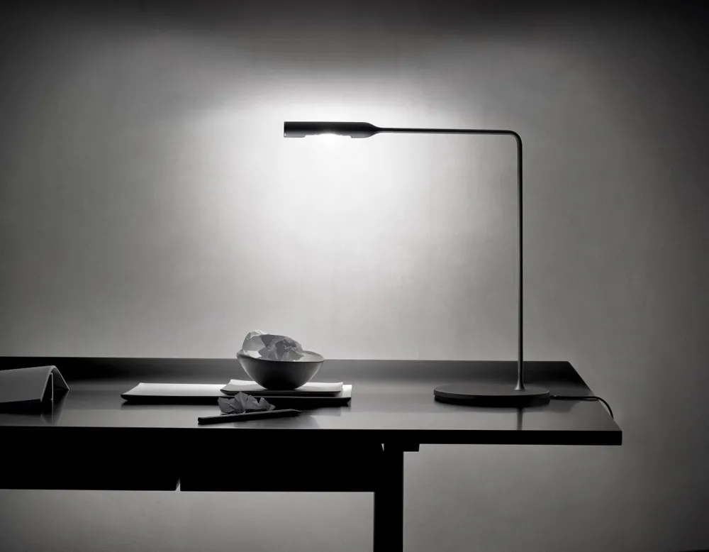 La gamme de luminaires Flo est le résultat de la première collaboration de Foster + Partners avec le fabricant d’éclairage italien spécialisé Lumina. Cette lumière minimale intègre la dernière technologie LED dimmable dans une forme cintrée et incurvée. Le corps pivote sur sa bas, la tête est orientable, et il est possible de choisir entre deux intensités. Extrêmement pratique, l’allumage se fait directement à l’extrémité de la tête.