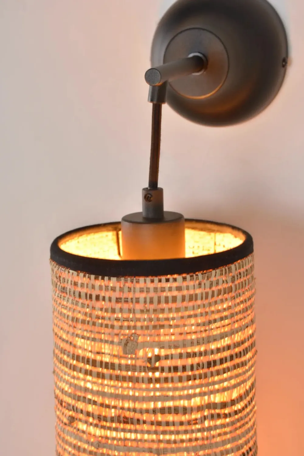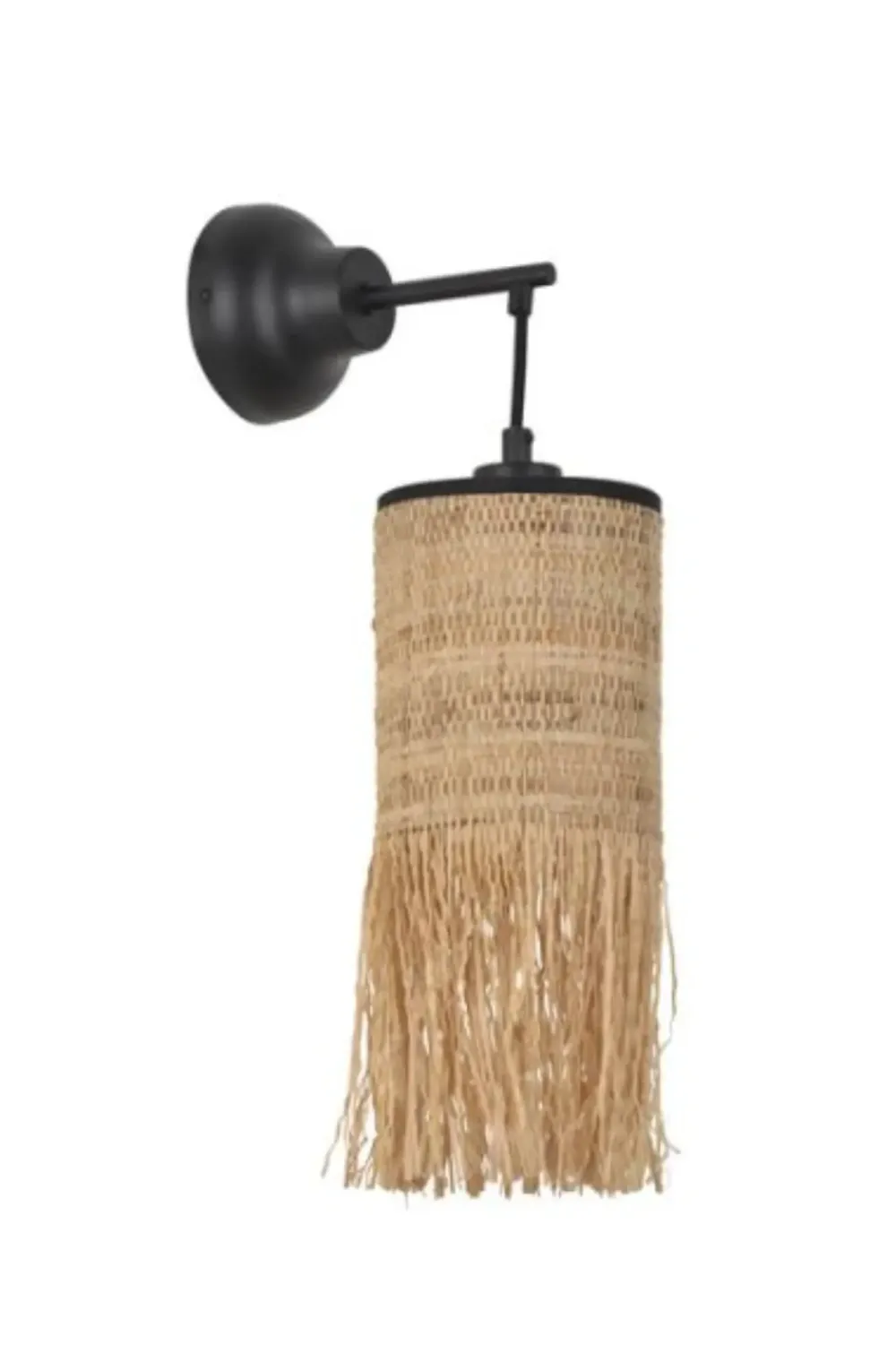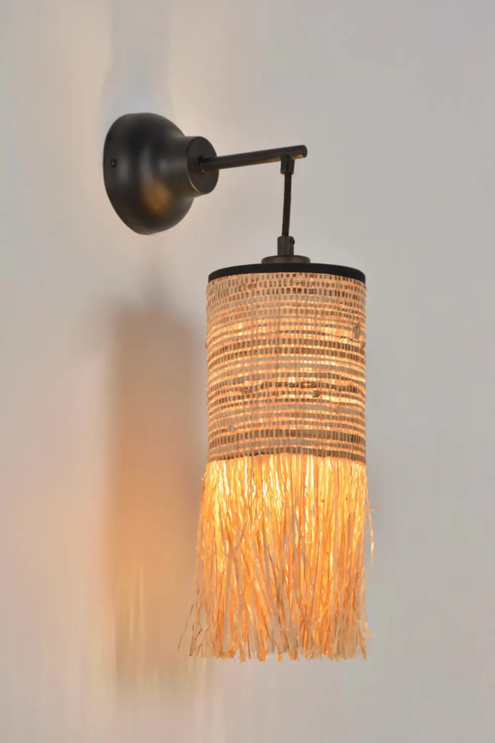 Applique murale FORMENTERA au design bohème chic, avec abat-jour en bana et franges en raphia faites à la main. Une invitation à l’évasion et au bien-être.