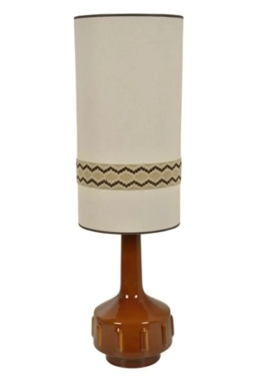 Lampe de sol avec base en céramique à motif en relief. Abat-jour tubulaire avec cover en tissu et finitions en laiton. Équipée d’un cordon textile.