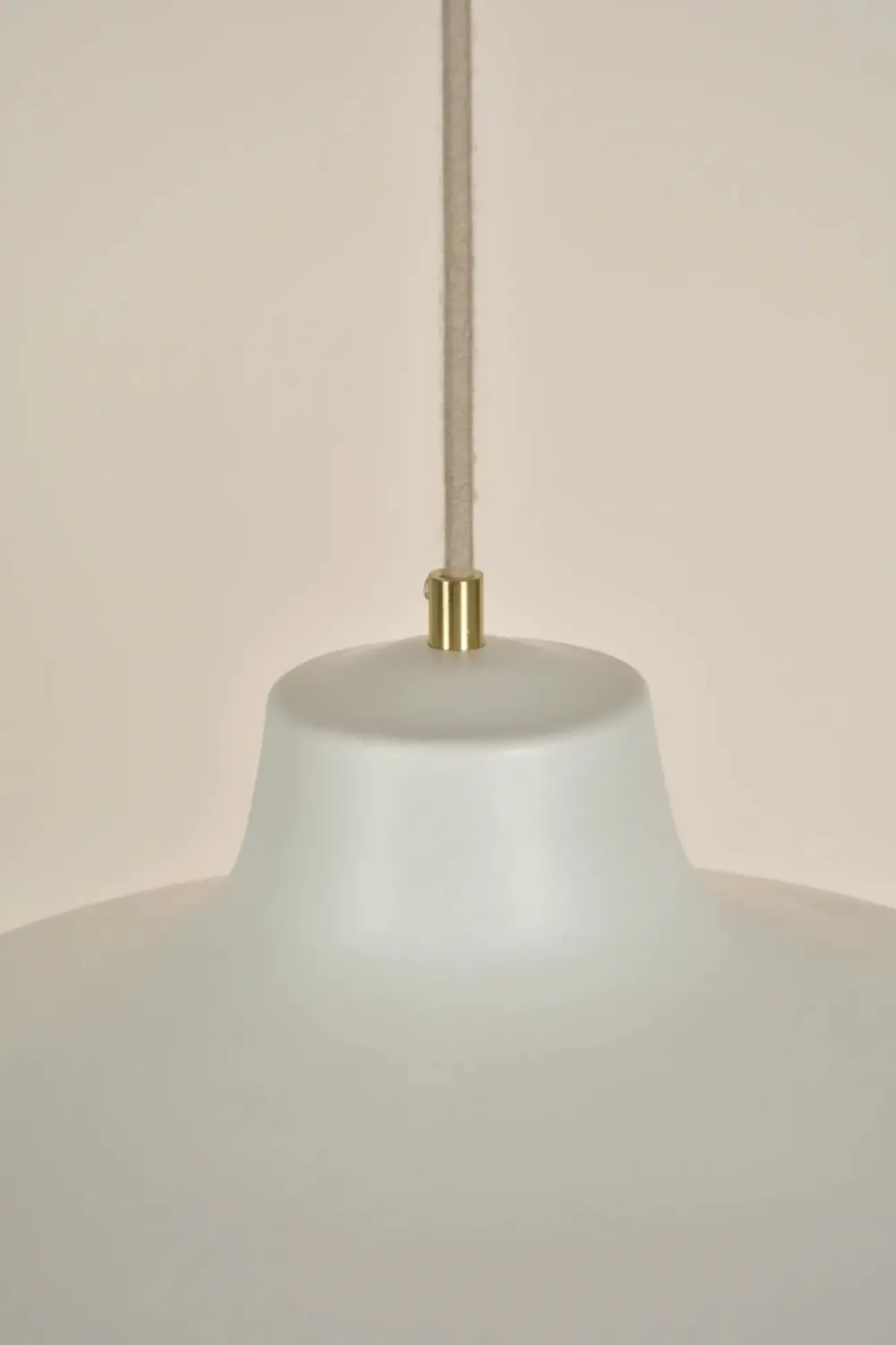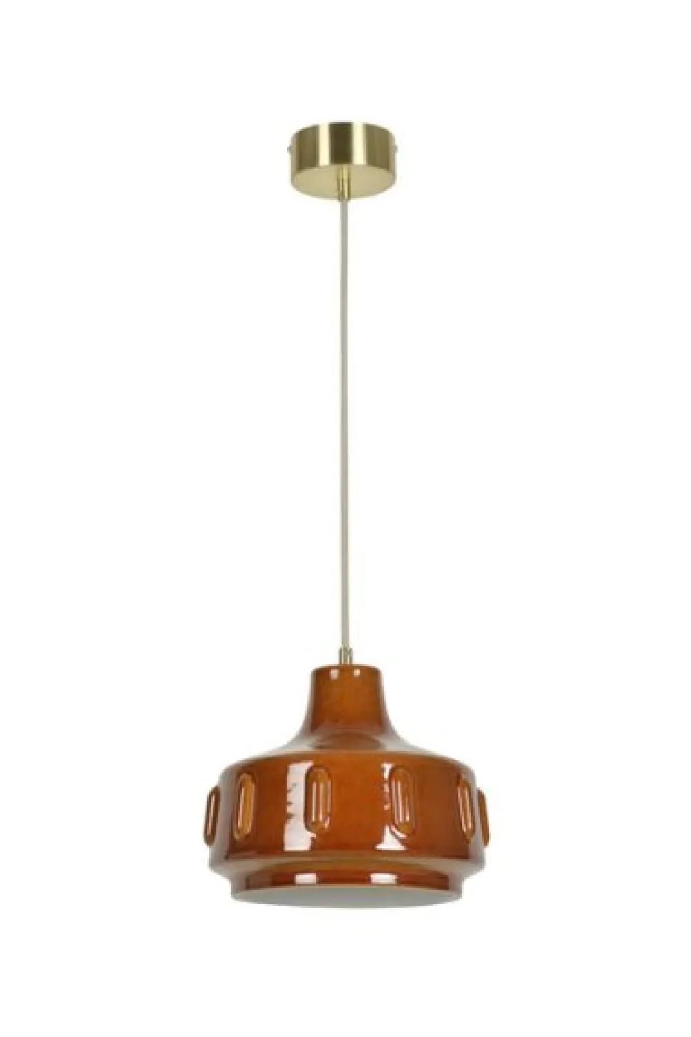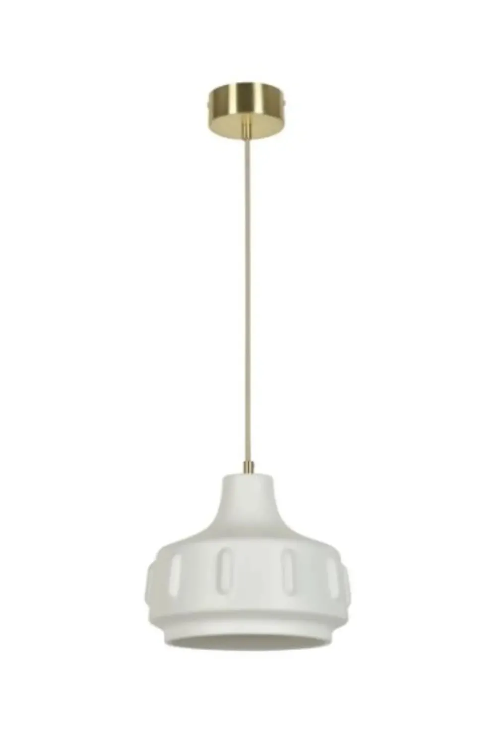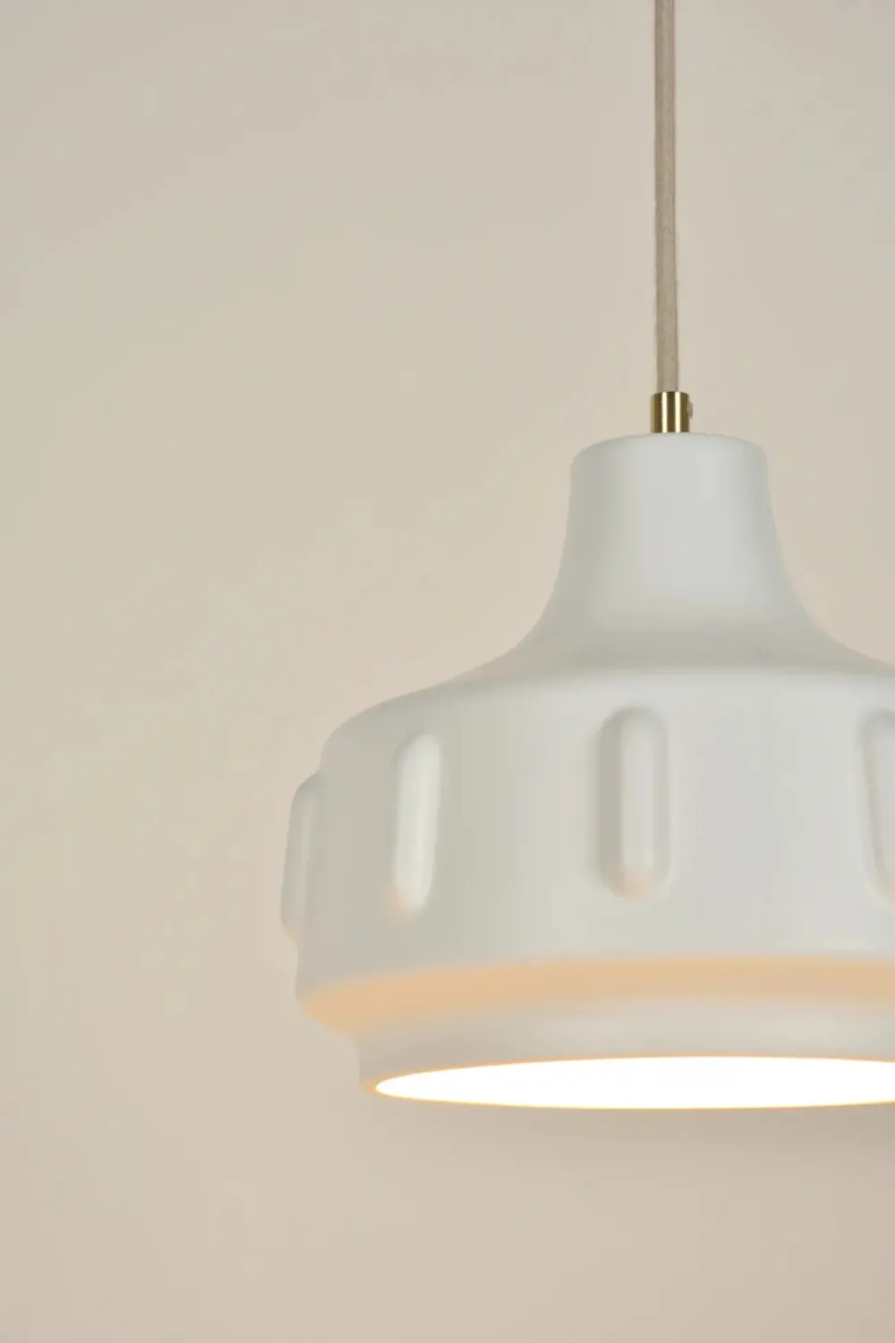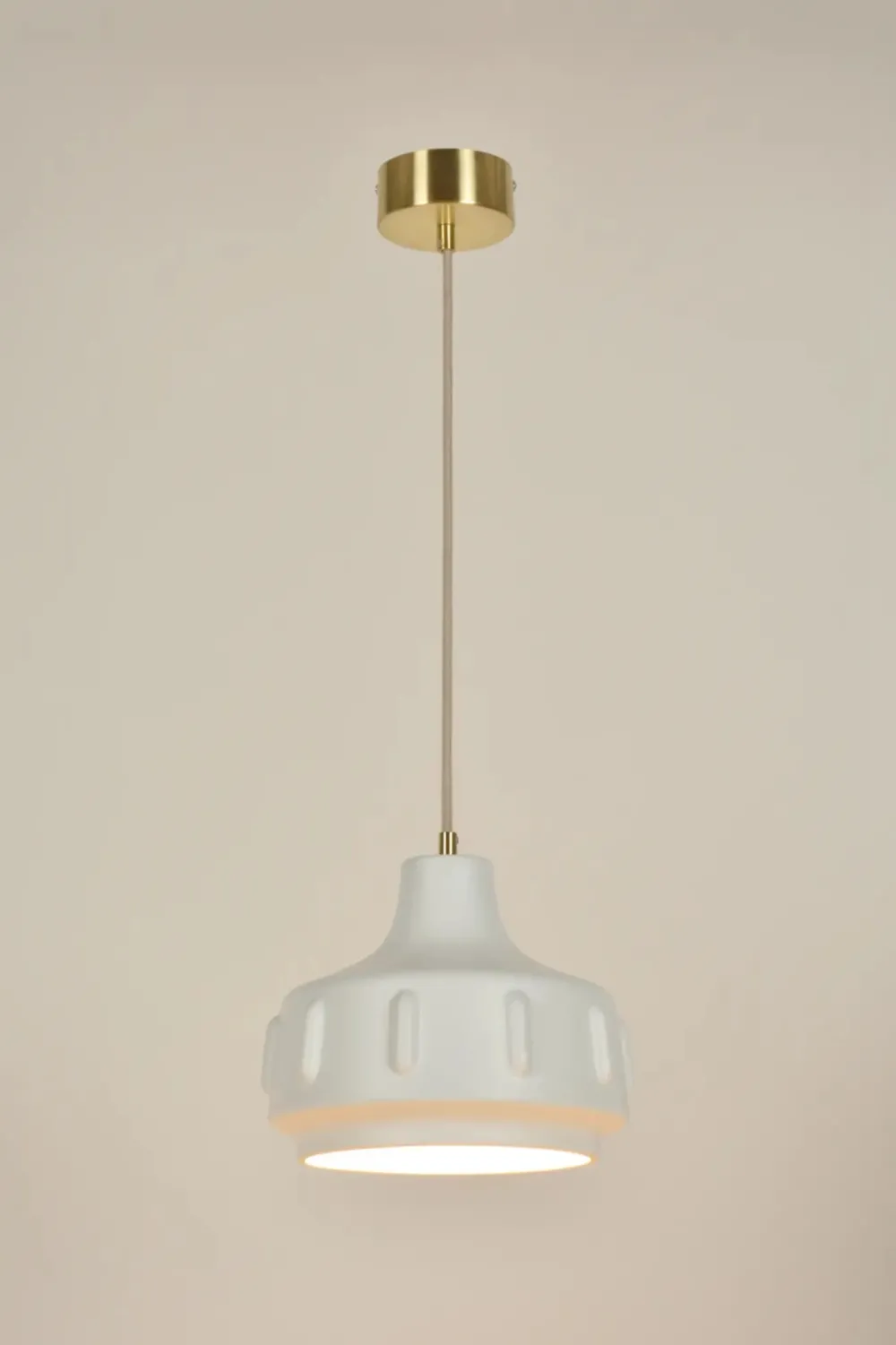 Suspension en céramique avec motif relief, équipée d’un cordon textile et de détails en laiton. Design élégant et moderne, adaptable DCL pour une installation facile et pratique.