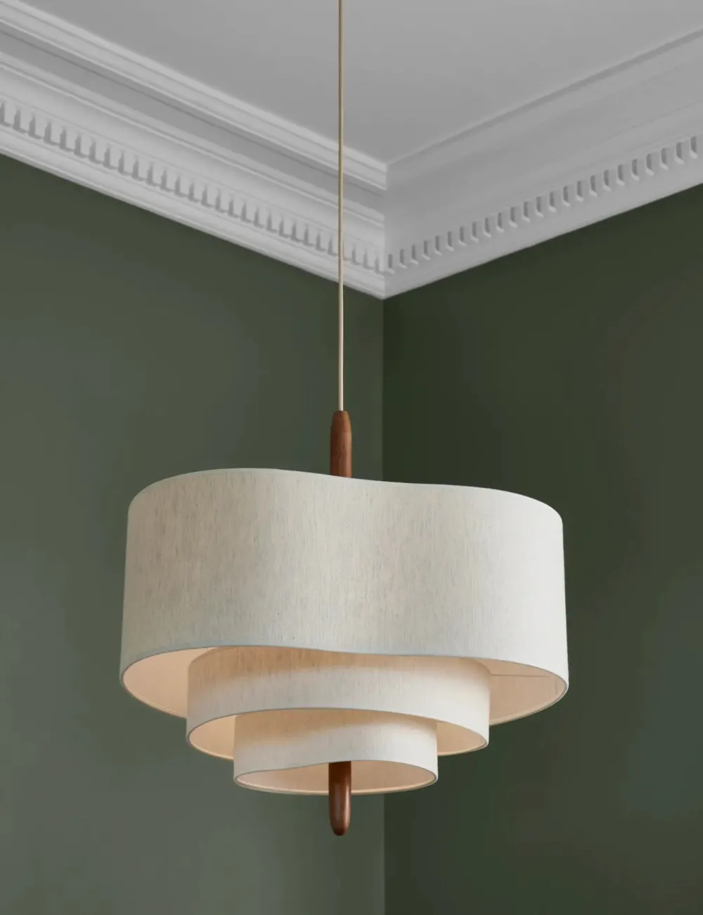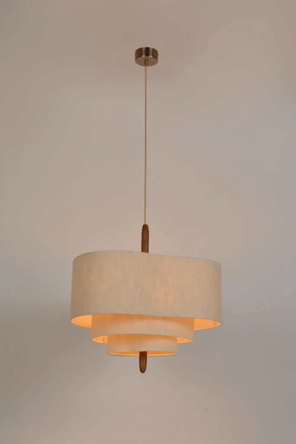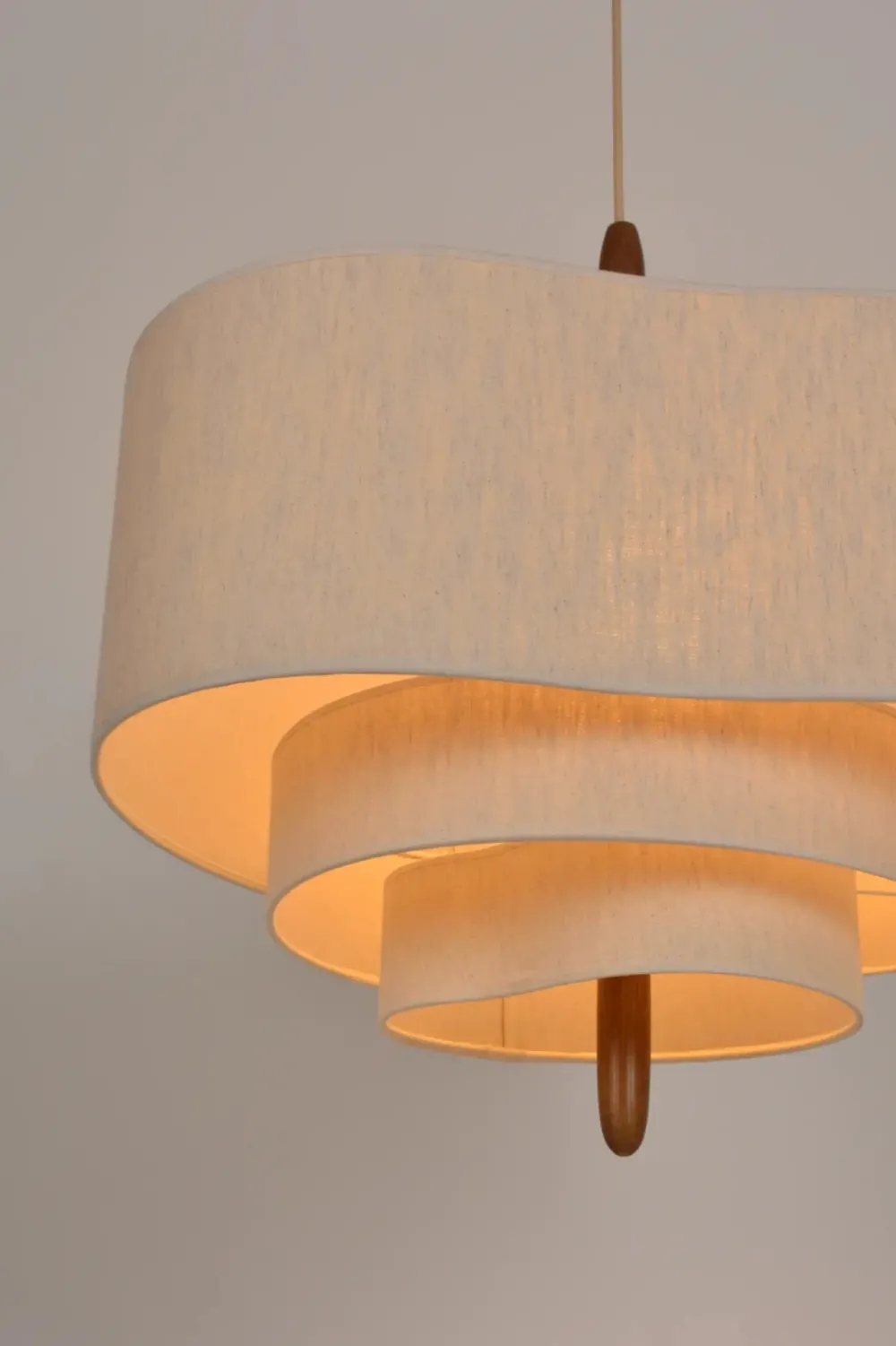 Suspension PEBBLE avec 3 abat-jour en tissu, offrant une lumière douce et réconfortante. Son design organique, combinant coton, lin, bois et métal brossé, crée une ambiance apaisante et élégante. Parfaite pour un intérieur cocooning.