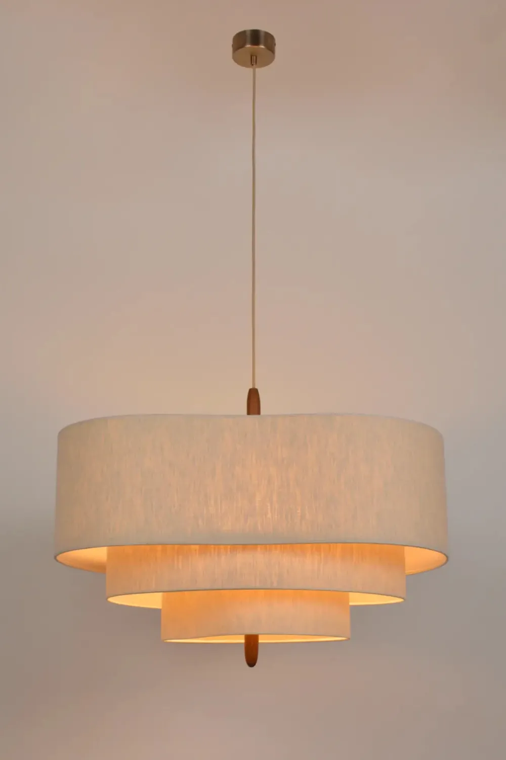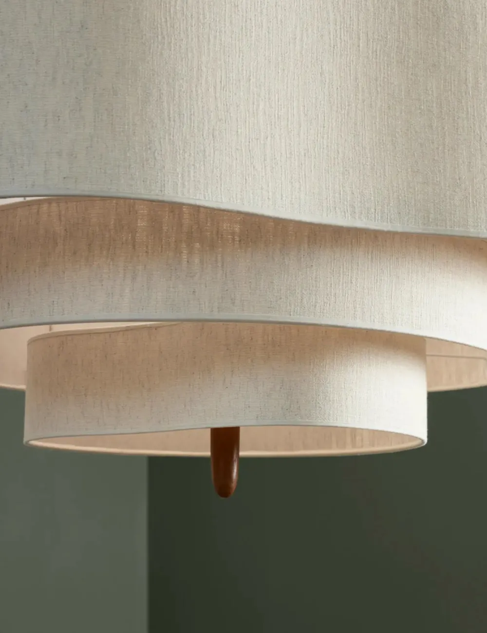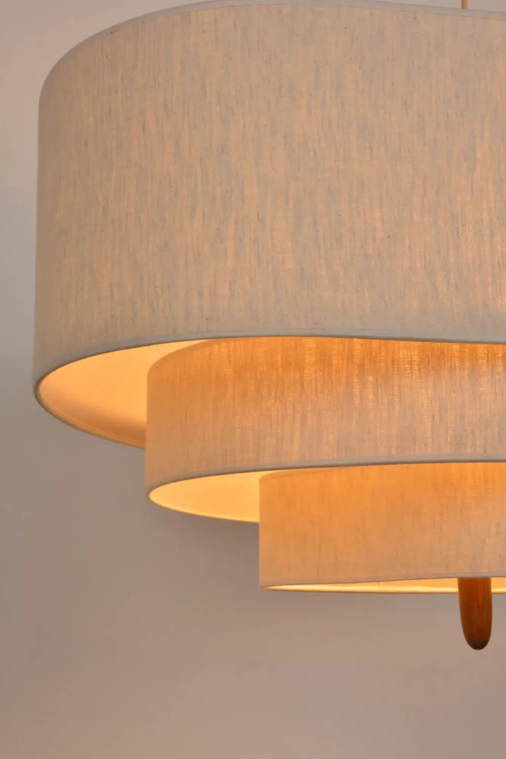 Suspension PEBBLE composée de 3 abat-jour en tissu, alliant douceur et élégance. Son design organique avec tissu écru, bois teinté et métal brossé crée une atmosphère apaisante et moderne, idéale pour un intérieur cocooning.