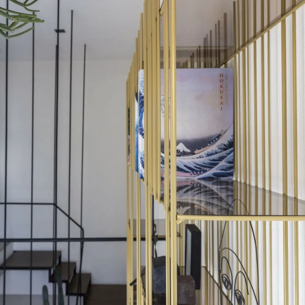 La structure est simple, le rythme est marqué par les tiges de fer fixées à différents intervalles sur une structure ouvertement rigoureuse à l’intérieur de laquelle les livres et objets insérés complètent la forme en écrivant de temps en temps de nouvelles compositions. Metrica est une bibliothèque en métal disponible dans les finitions titane, bruni et or avec des étagères en cristal transparent disponibles en bronze ou vert. Etagères fournies en Bronze, en vert sur demande.