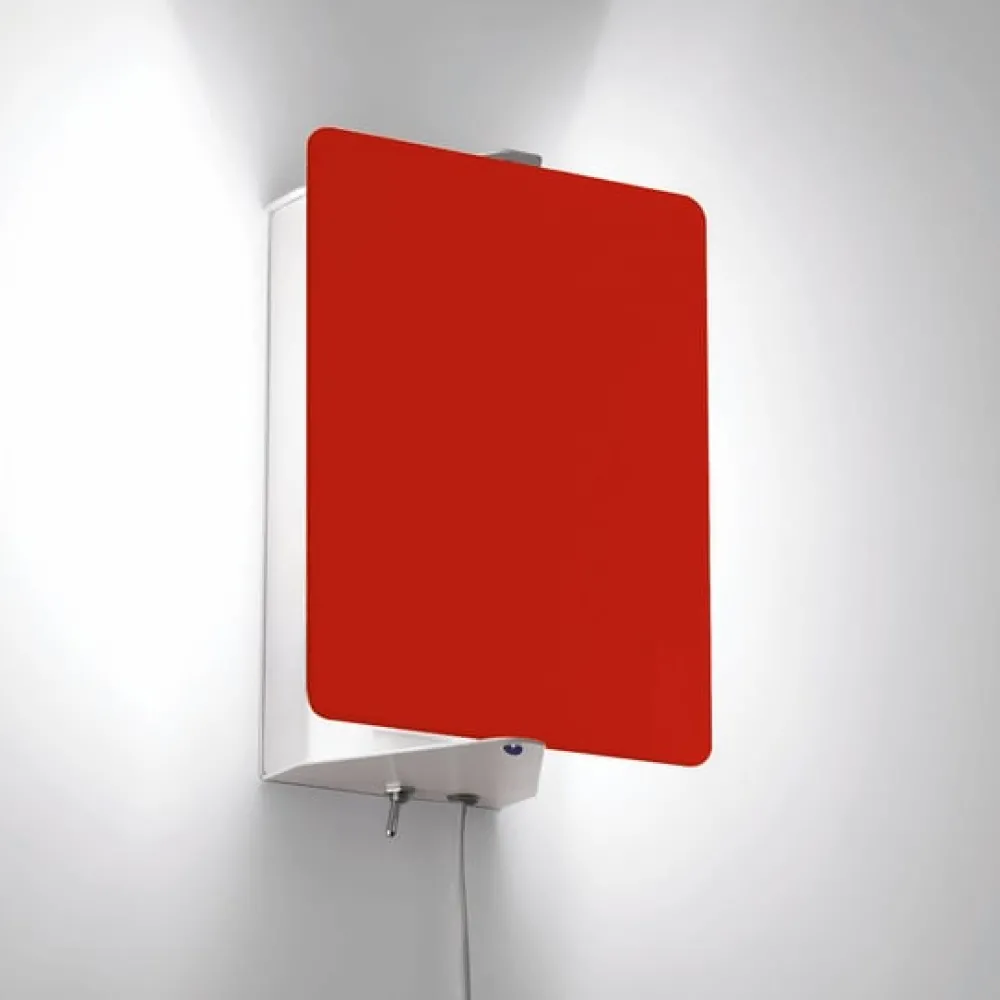 Famille d’appliques murales avec diffuseur en aluminium à volet ajustable et structure en métal. La structure est toujours peinte en blanc, le volet peut être en différentes finitions, en acier inoxydable anodisé naturel, anodisé noir ou poli miroir. Dans la petite version E14 et les versions à LED, le volet peut être peint en rouge, jaune ou bleu. Dans la version E14, l’interrupteur est positionné sur la structure de la lampe et la lampe est équipée d’un câble et d’une fiche pour une installation simple. La lampe émet une lumière indirecte vers le mur et le faisceau peut être orienté à volonté.