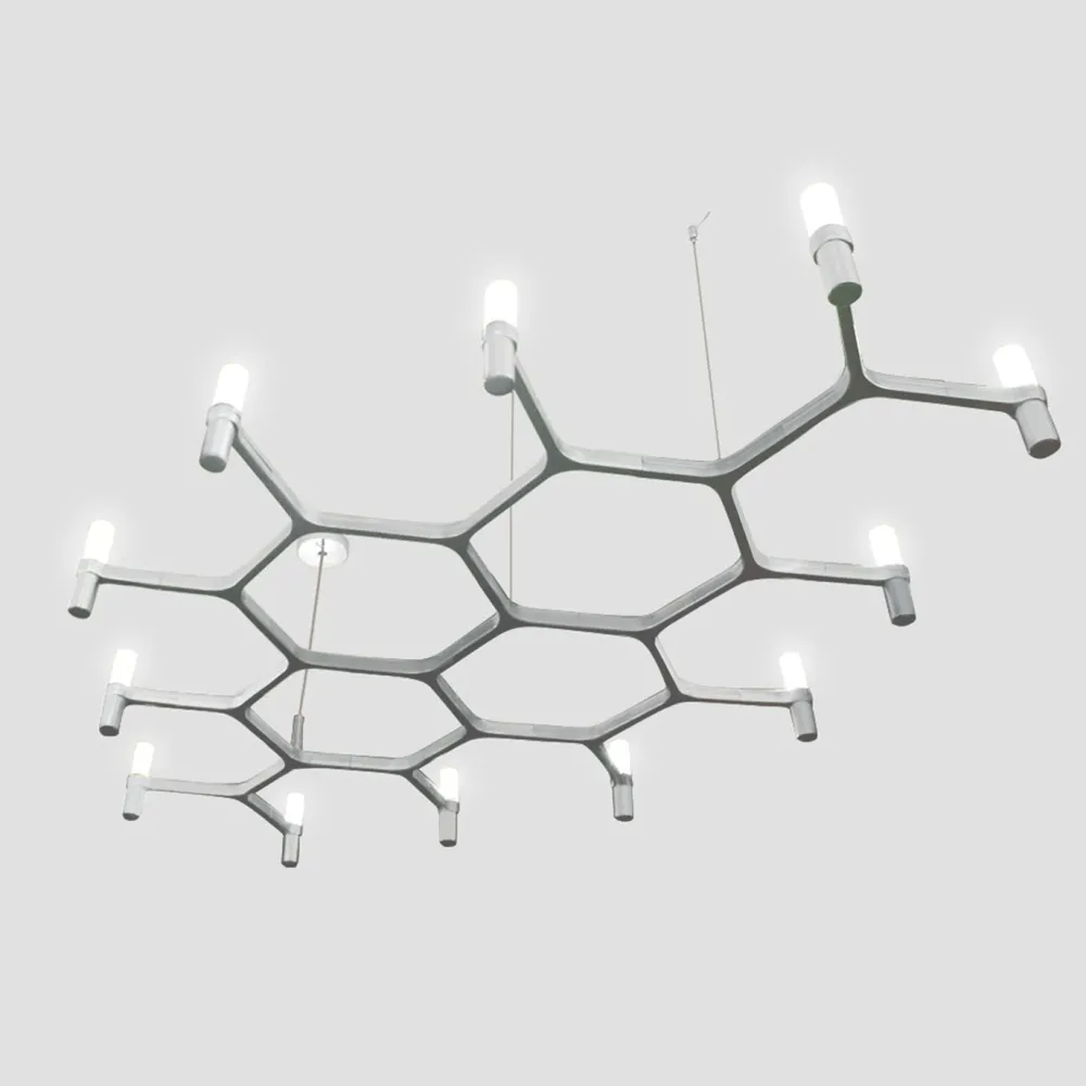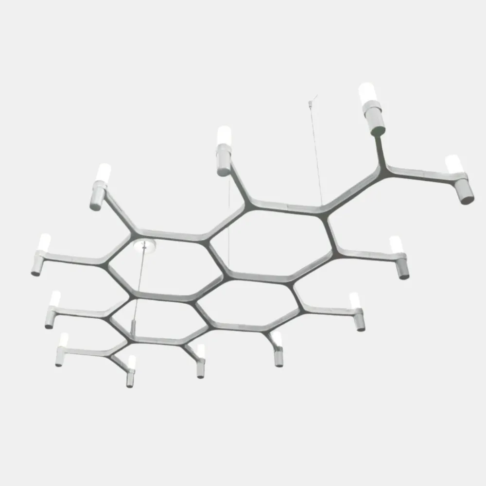 Famille composée de lustres suspendus dont la forme s’inspire du contour du cristal de neige. Lampes modulaires réalisées avec une structure en aluminium moulé sous pression et des diffuseurs en verre sablé.