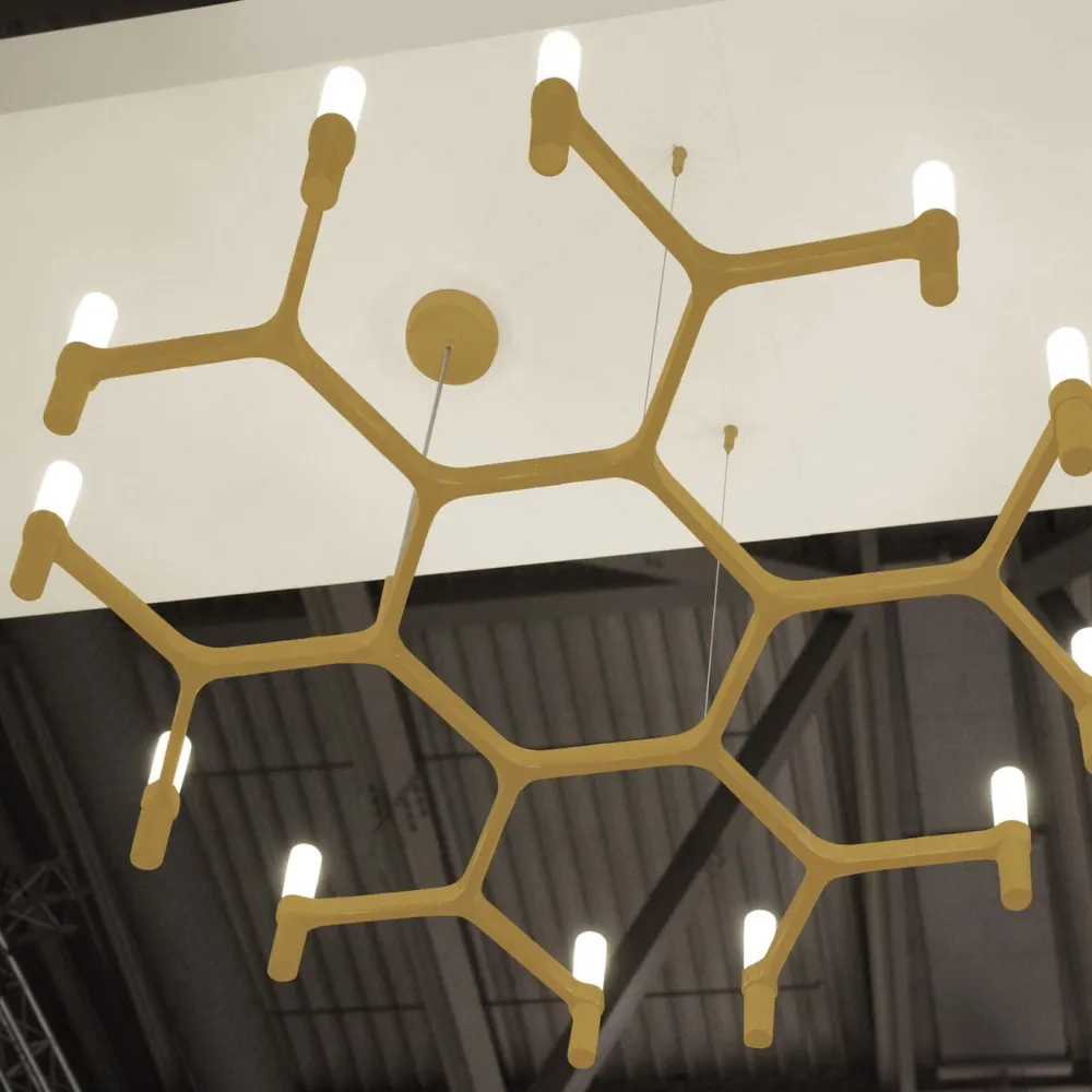Famille composée de lustres suspendus dont la forme s’inspire du contour du cristal de neige. Lampes modulaires réalisées avec une structure en aluminium moulé sous pression et des diffuseurs en verre sablé.