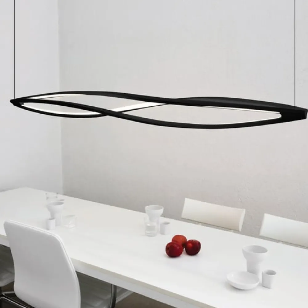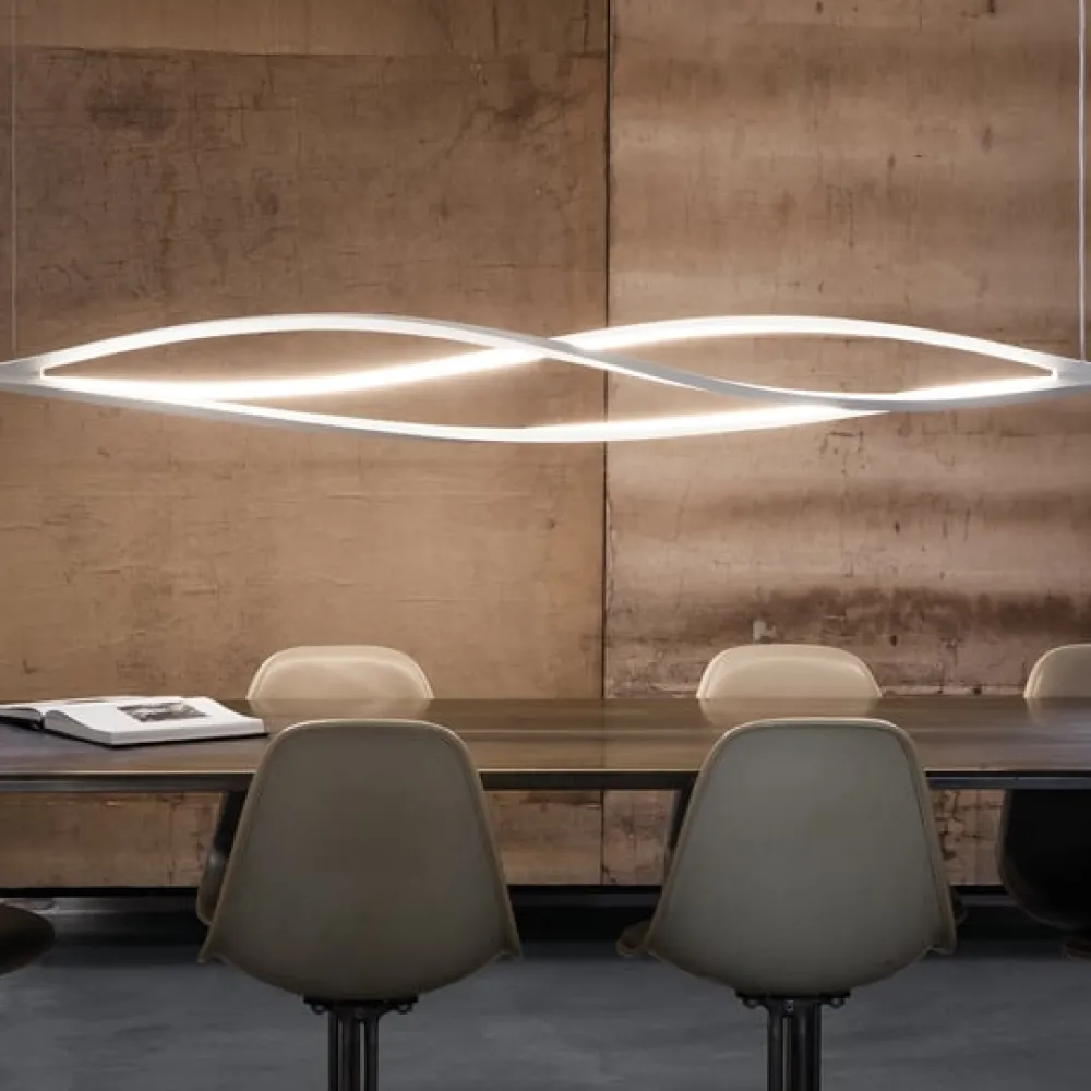 La suspension In the Wind est à la fois peu encombrante en hauteur, et donc parfaite pour des hauteurs sous plafond standard, et en même temps remarquable par sa forme. La forme de cette suspension est obtenue grâce à une technologie qui permet la torsion de l’aluminium, spécialement développée par Nemo. Cette suspension convient également pour les sorties électriques décentrées par rapport à la table.