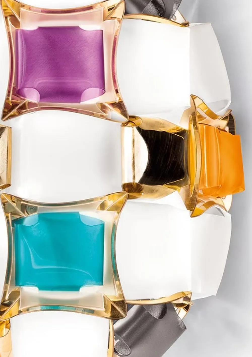 Mida s’inspire de la haute joaillerie, des dalles de pierres précieuses structurelles presque invisibles et des cabochons lisses et polis disposés pour former une couronne florale aux couleurs soyeuses et mouvantes. En combinant des pierres précieuses colorées et métalliques, le créateur donne vie à trois tailles différentes (5 couleurs chacune). Tous sont entièrement fabriqués à la main et équipés d’attaches magnétiques pour une installation rapide et un entretien facile.
