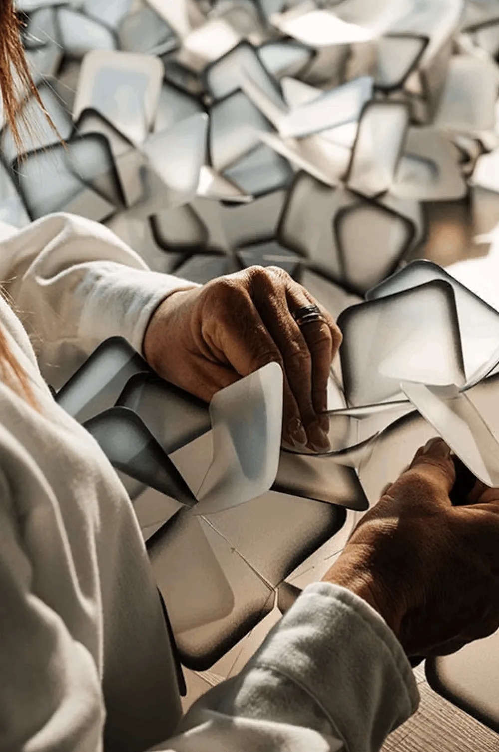Des formes régulières, encastrées selon un équilibre parfait de transparence et de reflets, composent le design de Clizia. Cette lampe reprend les formes de la nature : c’est un nuage qui capture la lumière du soleil aux premières heures du jour et qui se charge de reflets chatoyants, c’est la cime d’un arbre à travers laquelle filtre la lune en créant des jeux d’ombres. Les versions dans lesquelles elle est disponible conjuguent esthétique et fonctionnalité : toutes sont dotées d’un support magnétique qui ancre la lampe aux surfaces (plafonnier et suspension) ou à sa base métallique (de table ou de terre).