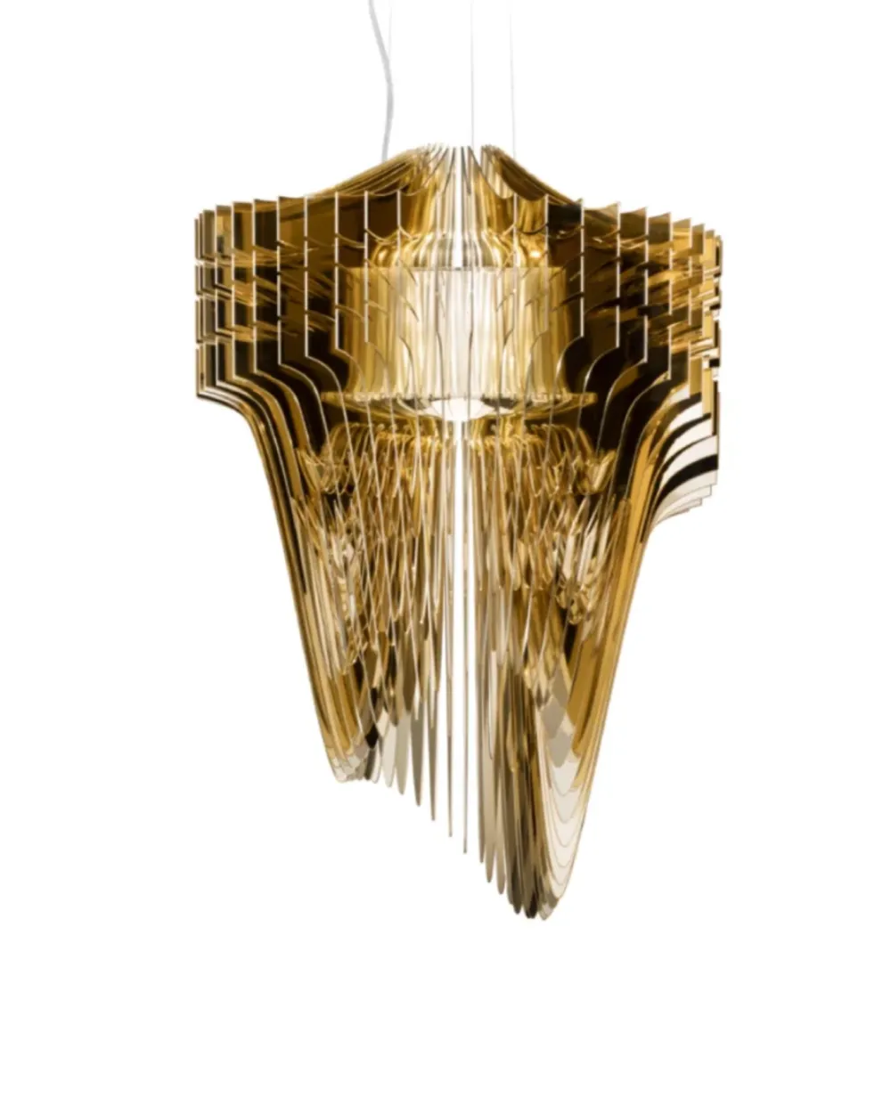 Disponible dans plusieurs finitions (noir fumé, transparent, or métallisé), cette suspension est un symbole fort du design contemporain, mariant technologie, poésie et sophistication.