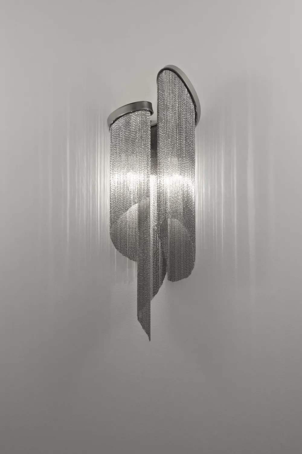 Stream est une applique décorative qui laissera une lumière douce et chaleureuse se diffuser au travers de ses fines chaînes argentées.