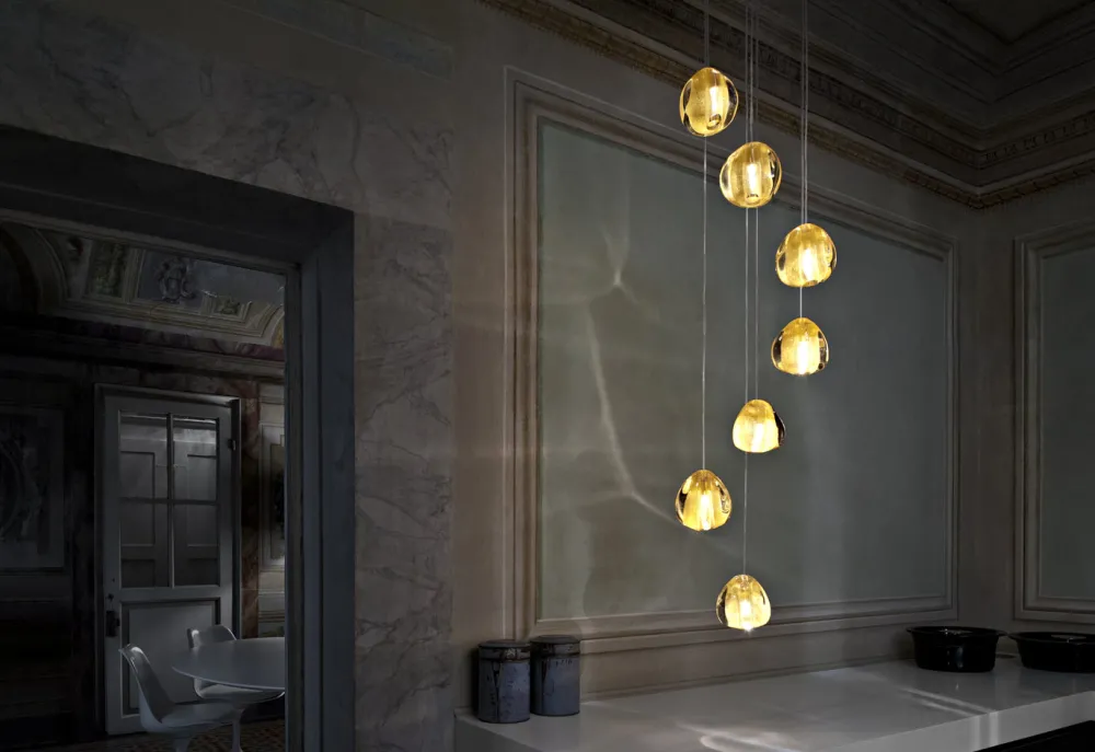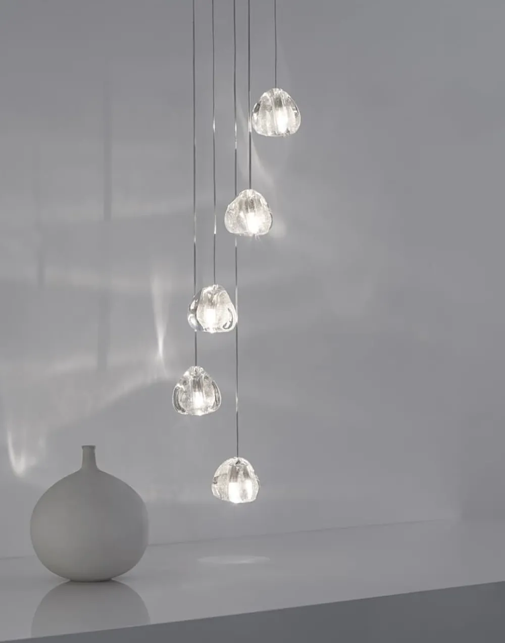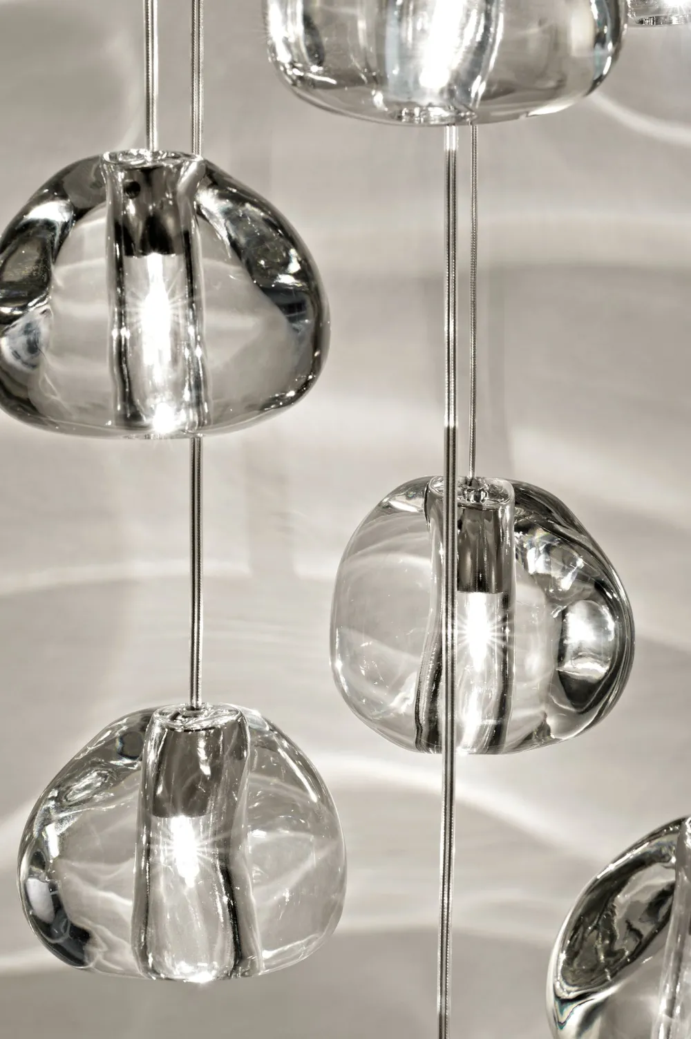 Inspirée par la lumière tranquille et envoûtante des reflets créés par l’eau, Mizu est unique. Comme des gouttelettes d’eau, pas deux Mizu se ressemblent, chaque forme de verre est unique et faite méticuleusement à la main. En utilisant uniquement le verre le plus clair, Mizu reproduit parfaitement la réfraction de la lumière de l’eau, projetant des motifs étonnants dans la pièce. Également disponible en feuille d’or et argent.