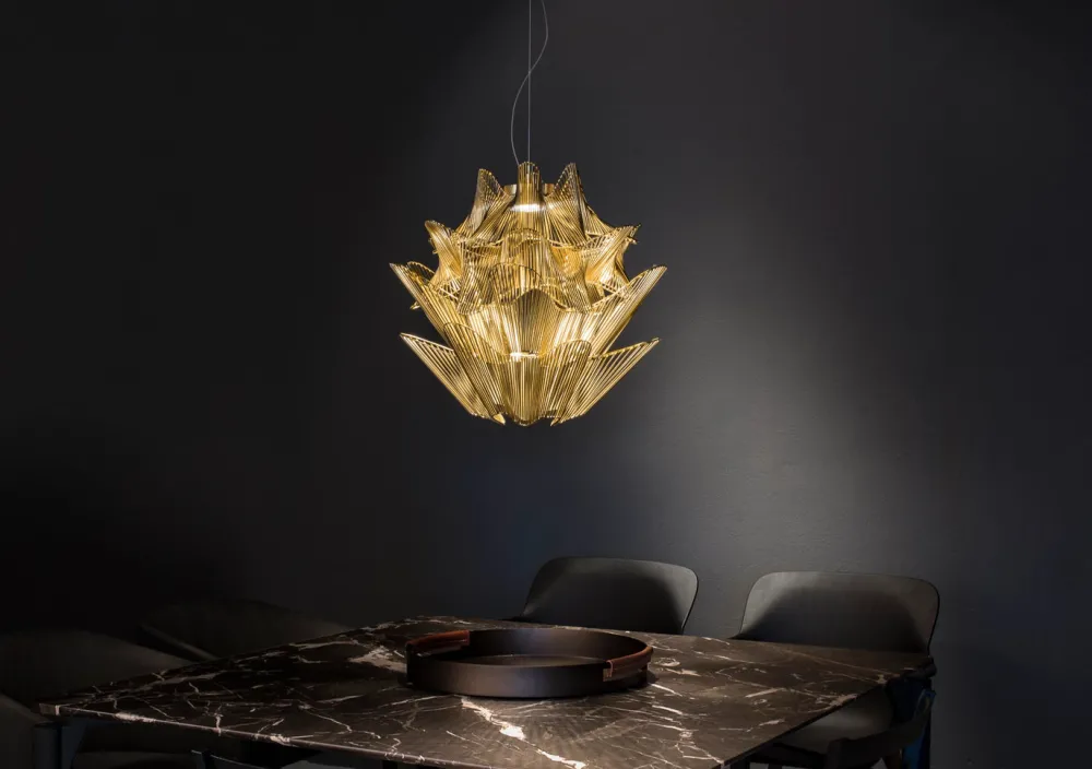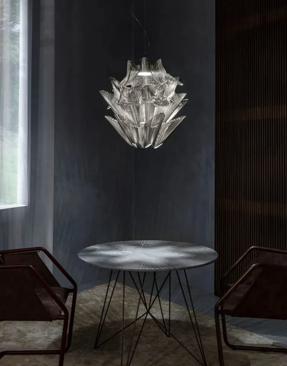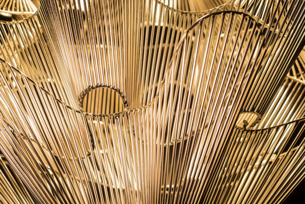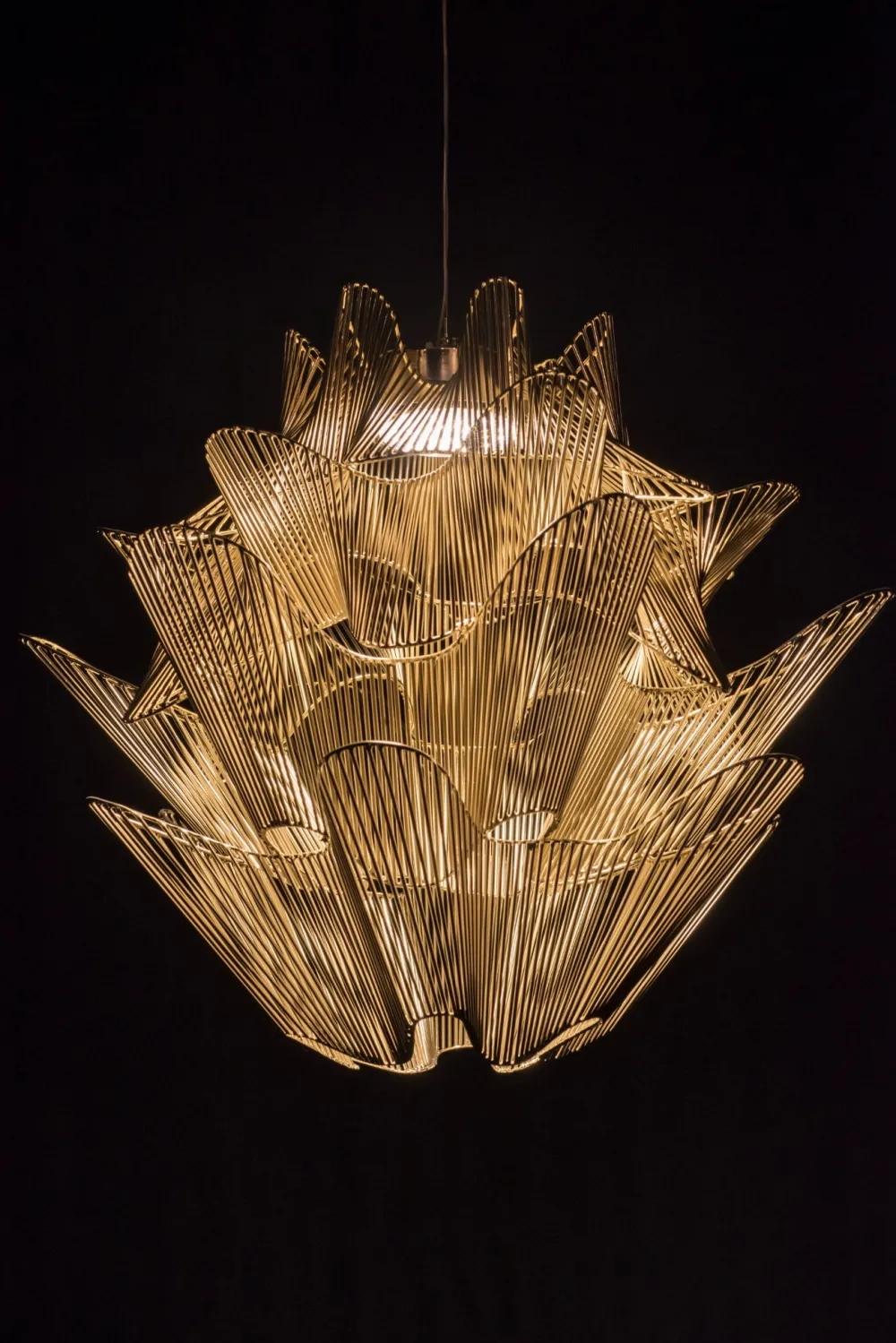 Moiré est un terme dérivé de la soie, désignant un aspect ondulé évoquant le mouvement de l’eau. La fabrication de cette suspension est obtenue en superposant des grilles métalliques qui se chevauchent, créant ainsi une dynamique particulière. Elle fascine au premier regard.
