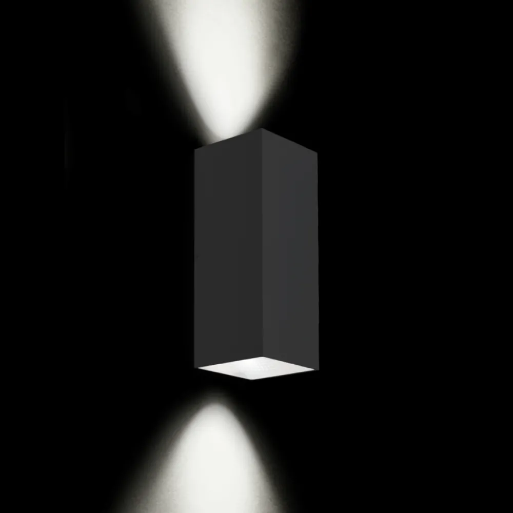 Train 2.0 est une applique IP65 conçue pour l’extérieur, offrant un éclairage indirect vers le haut et vers le bas en 3000K.